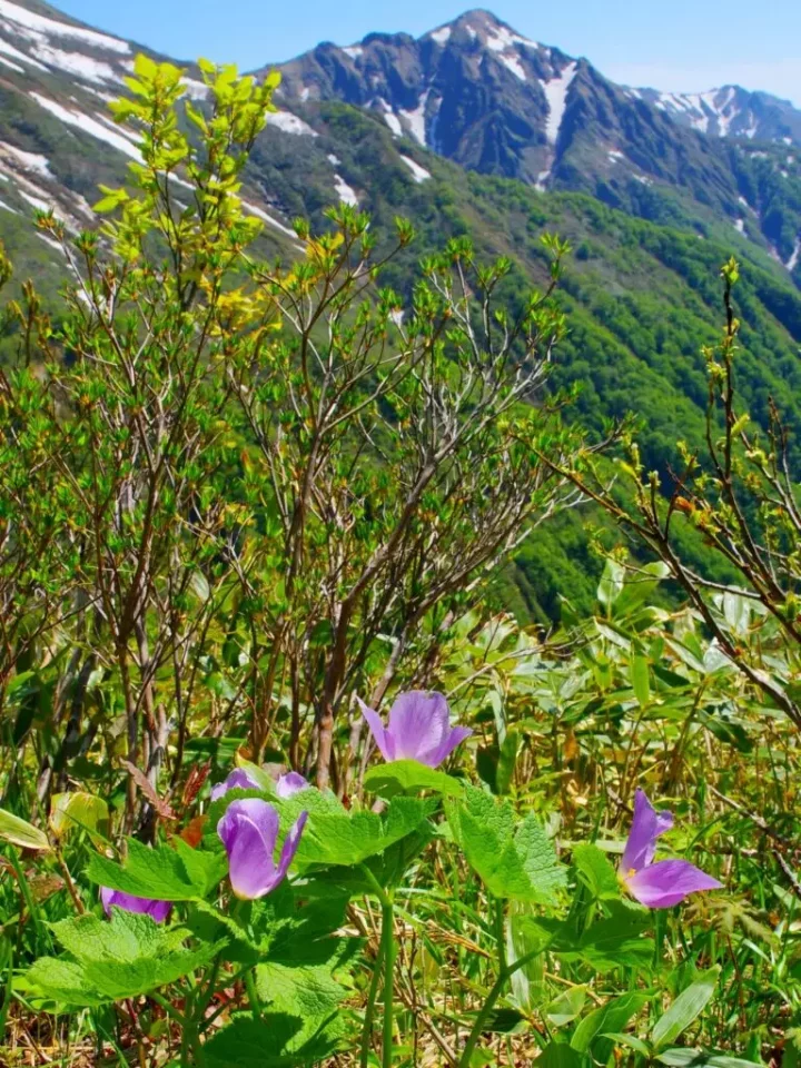 3日目も最高のお天気に恵まれました。大源太方面への稜線を少しを歩けばシラネアオイやムラサキヤシオ、イワカガミの開花を。花の百名山の片鱗を見ることができました。