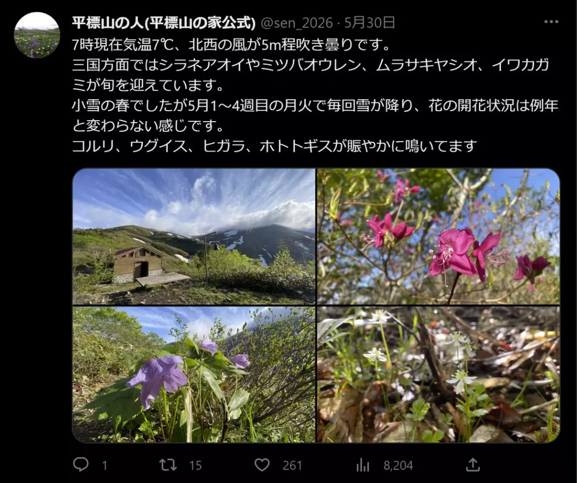 今後の開花状況につきましては「平標山の人」https://twitter.com/sen_2026 のツイートをご確認ください。