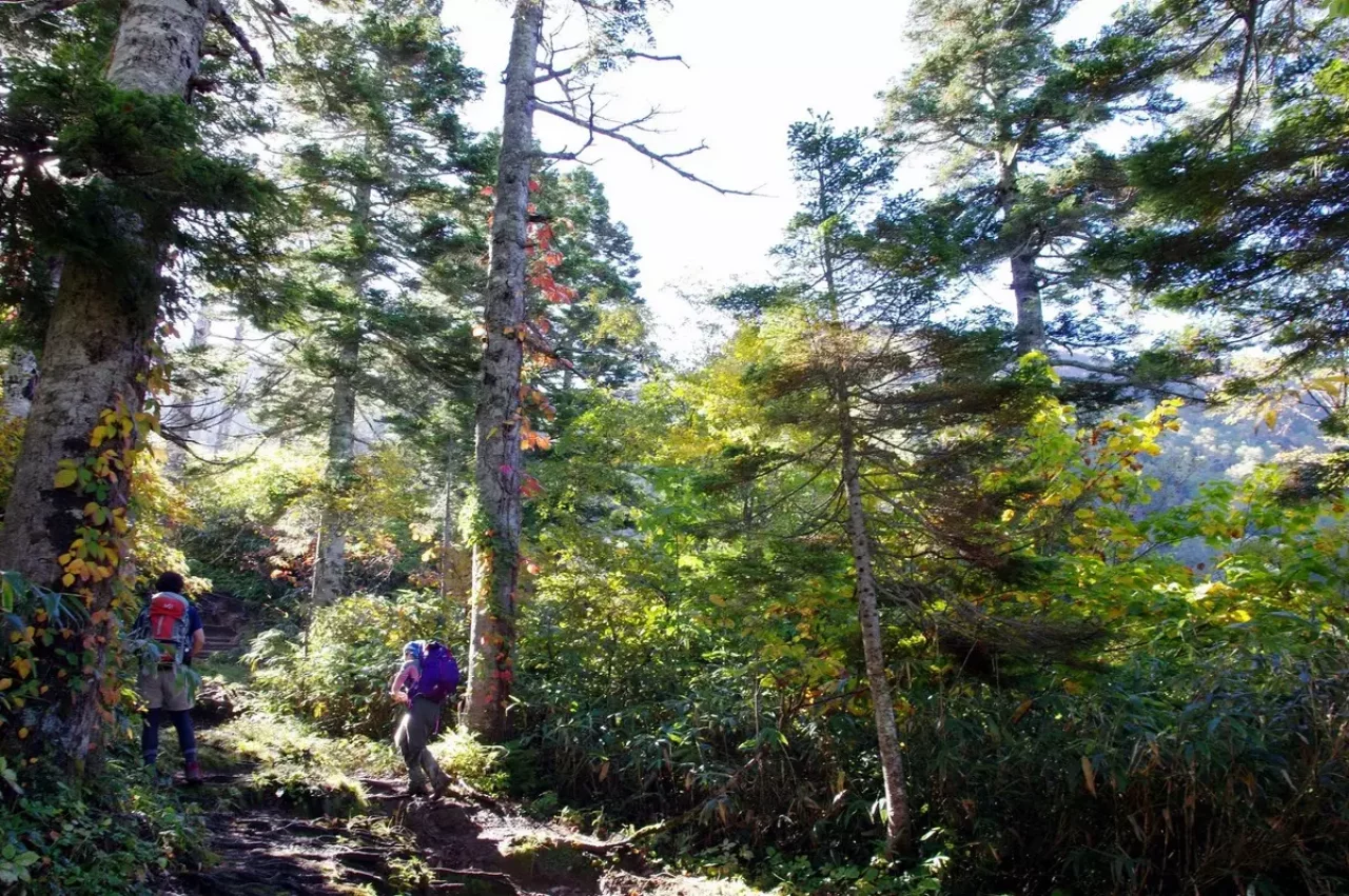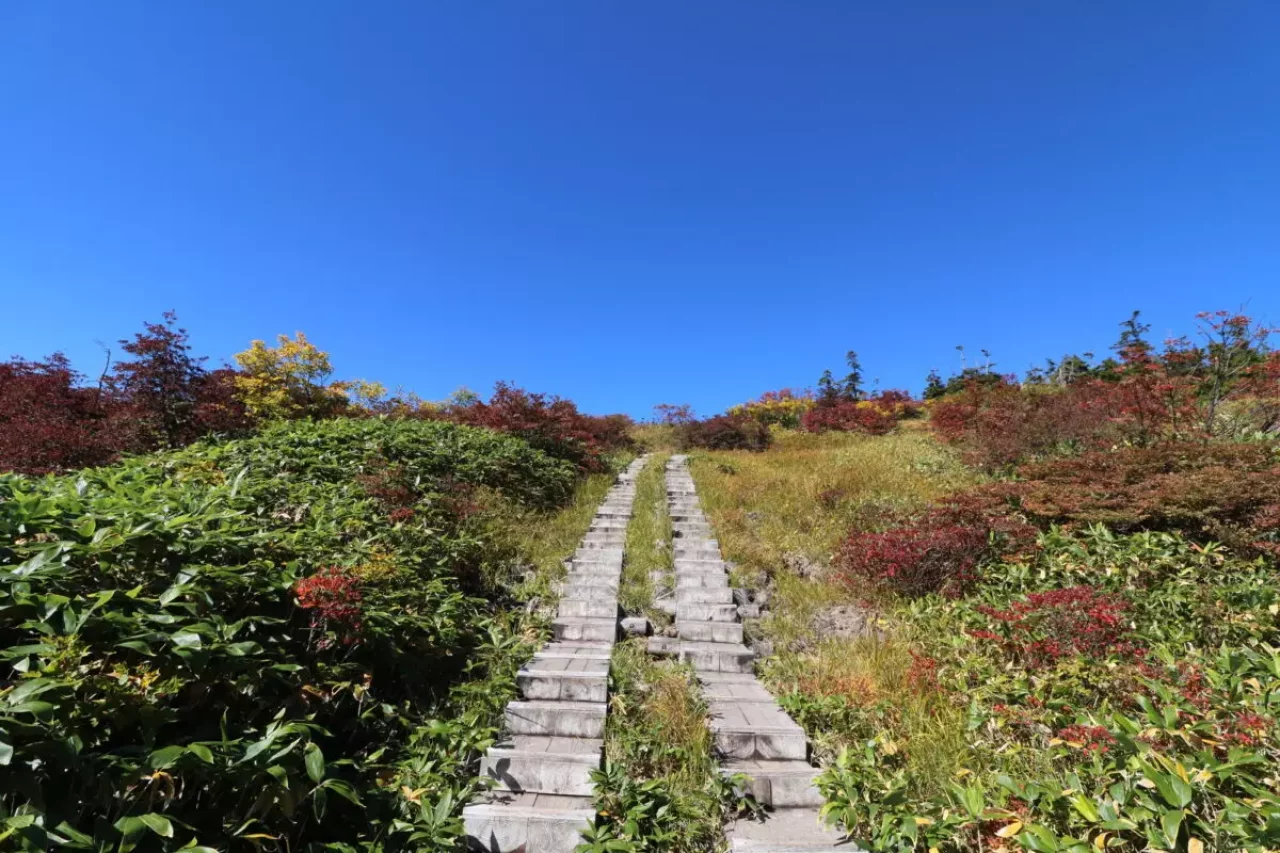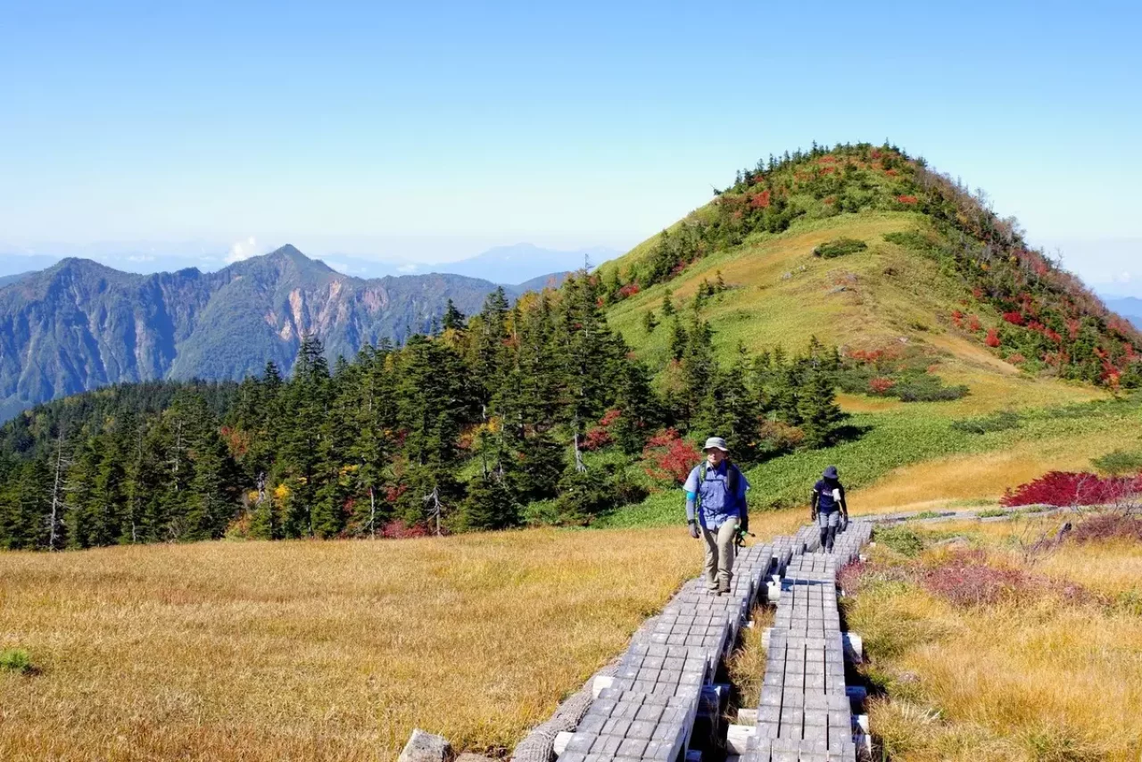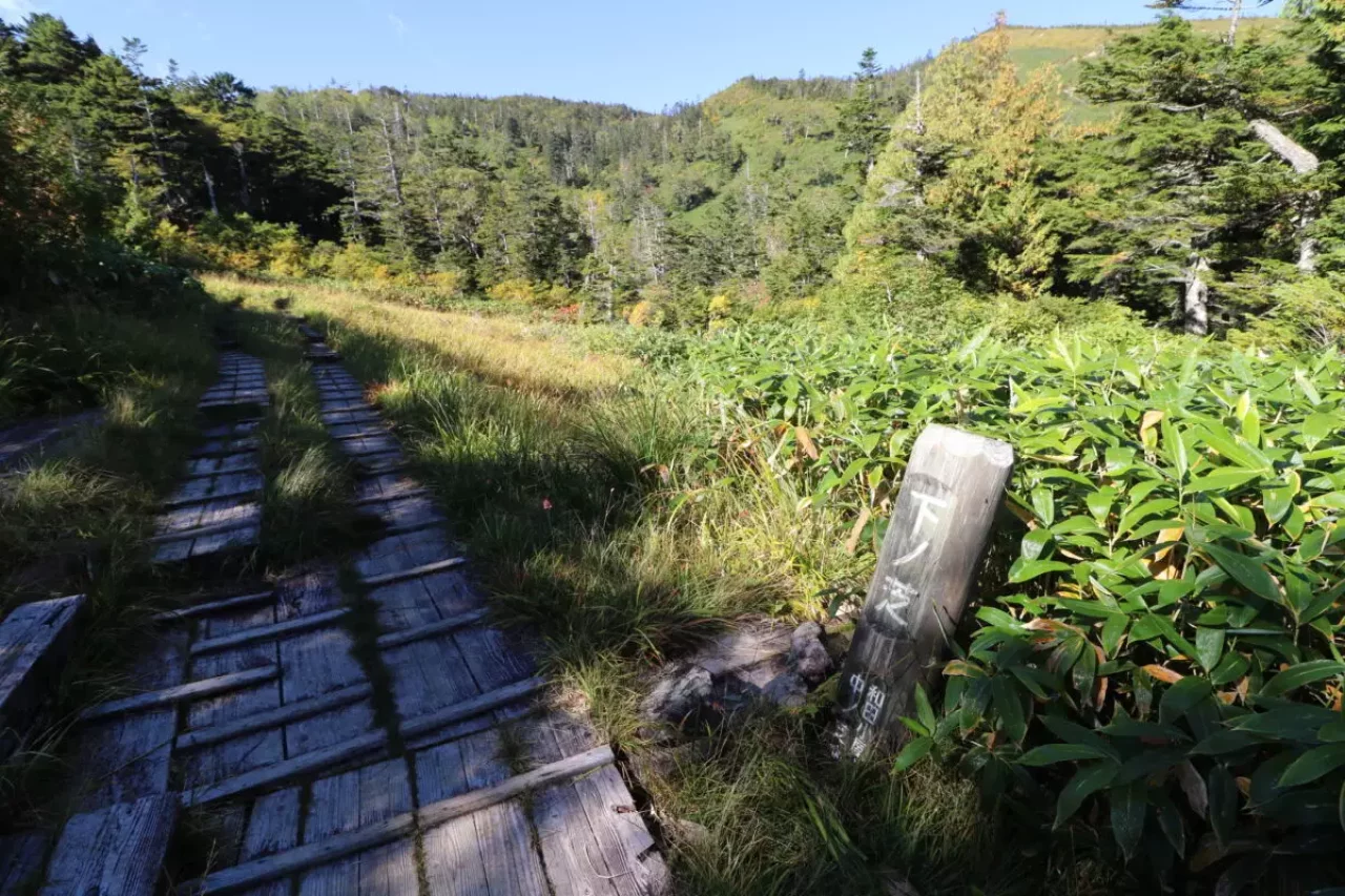 中の芝は最初の絶景ポイントです。樹林帯を超えて木道が敷かれており、すぐわきに高山植物がみられます。秋は赤く色づいた紅葉風景に様変わりします。