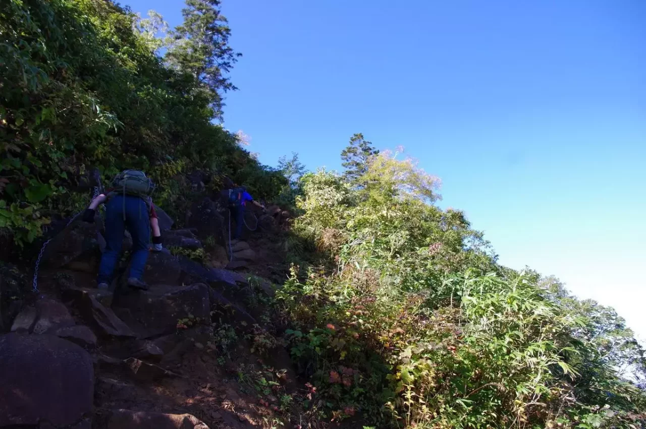 7合目からは急登となり、くさり場が連続する岩場を登ります。難易度はふつう程度で、初心者でも問題なく登れます。