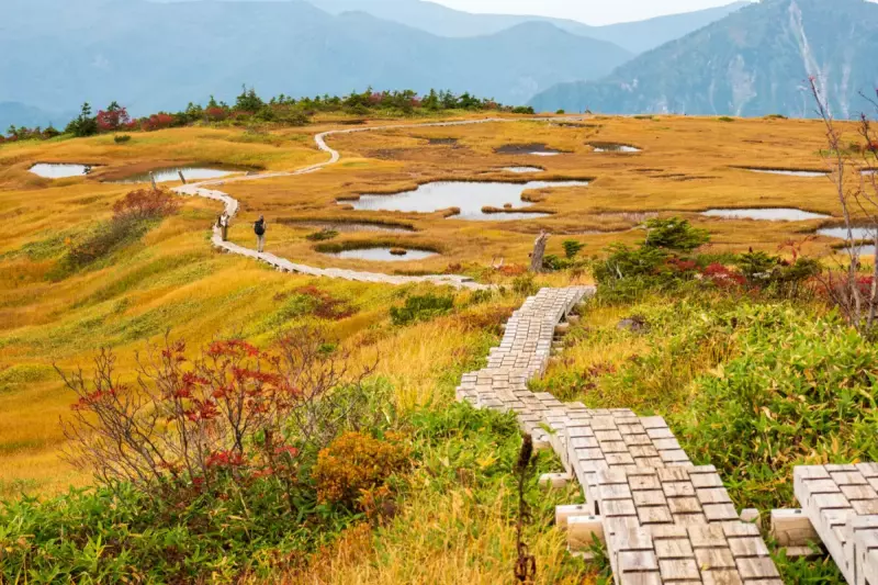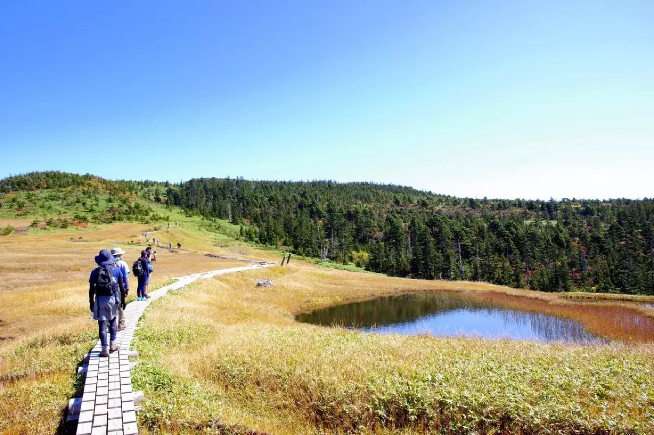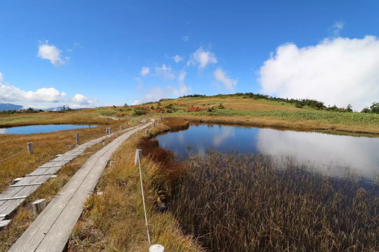 10月中旬には草紅葉が一面に広がり、木道、草紅葉と空や池の青が素晴らしいコントラストをみせ、まさに絶景です。