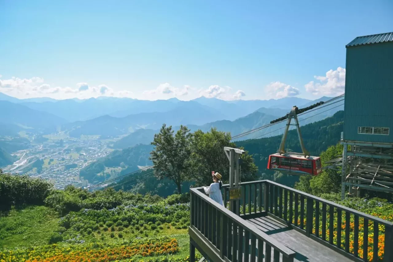 湯沢高原ロープウェイに7分ほどゆられながら登っていくと、アルプの里に到着します。ロープウェイの全長は約1,300m、世界最大級の166人乗りです。