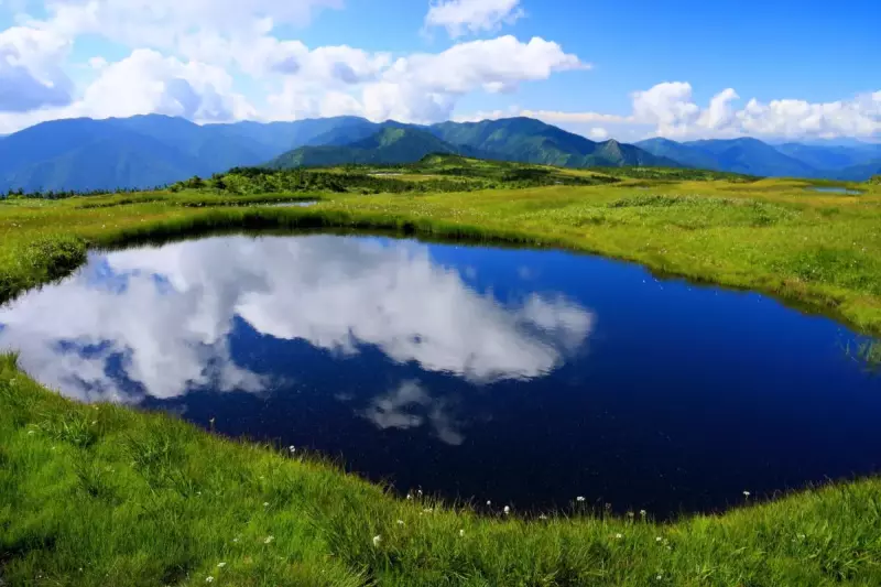 苗場山山頂の湿原には、無数の池塘が点在し、高山植物が咲き誇ります。