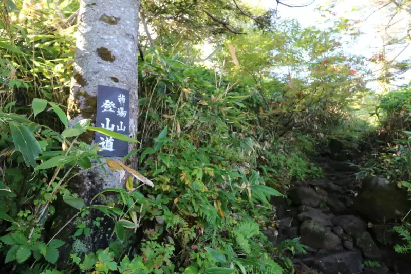 ゲレンデわきの登山口に入ると、しばらくは展望のない樹林帯の登り道が続きます。岩が多いため足元に注意しましょう。