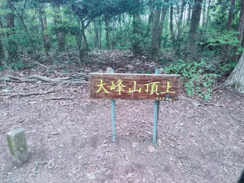 このまま武田尾駅方面なら向かって左へ進みます。雨の日トレイルと言いながらまだ雨は降っていないので更に大峰山(おおみねさん)に寄り道することにしました。大峰山へは石碑の後ろの階段を上がります。所要時間は往復で2時間です。
