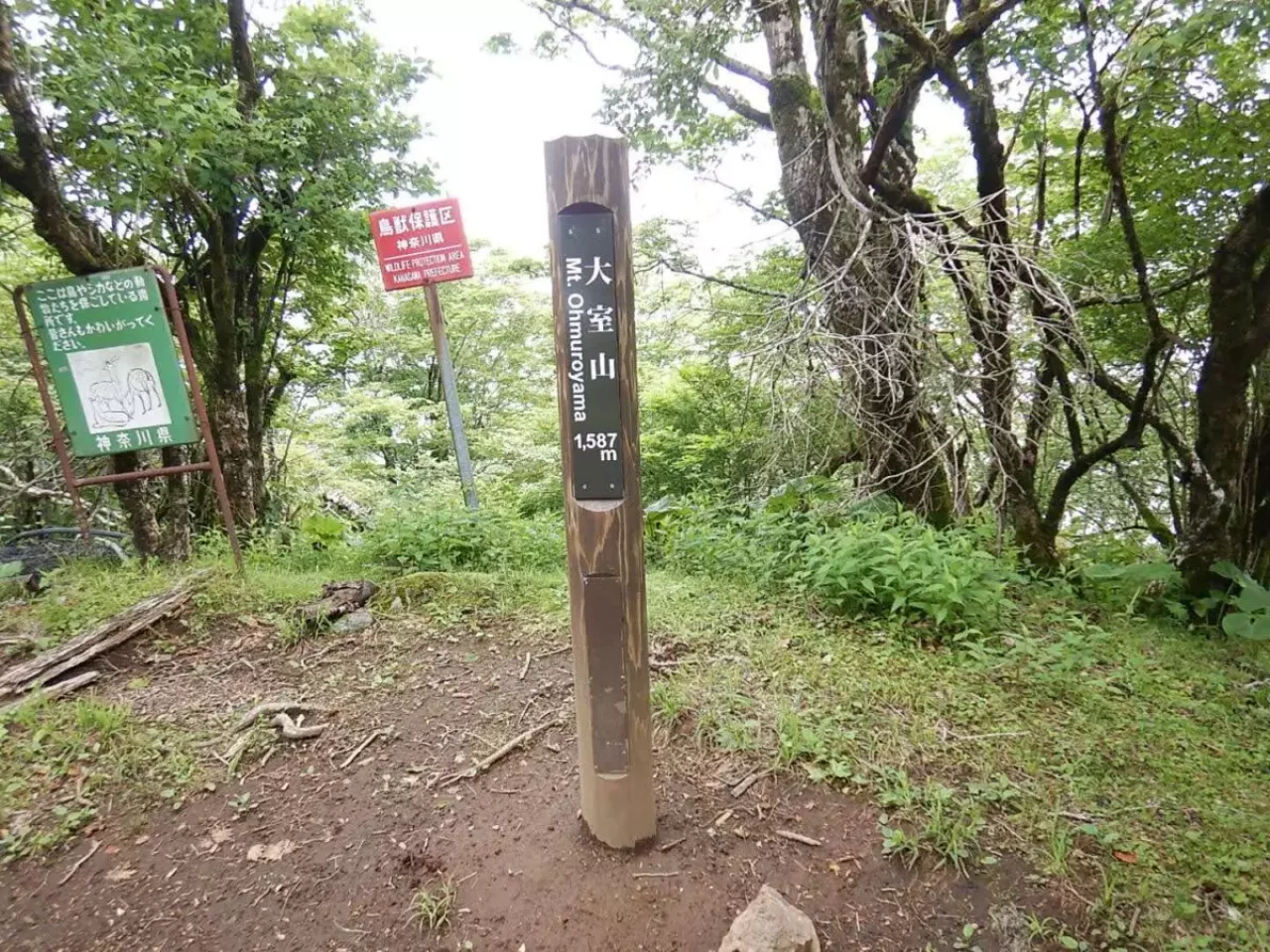 避難小屋の横から大杉丸ピークまで登ると平坦な道になり富士山のビューポイントが。ベンチ、クサリ場を通ると再び急登となりブナの樹林帯に入るので、そのまま稜線伝いに歩いていくと大室山の西の肩に出ます。右に進むと数分で展望のない大室山山頂に到着します。