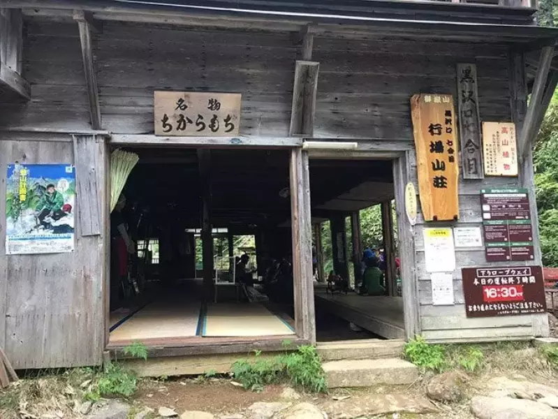 登山口から程なく行場山荘に。非常に趣のある今まであまり見たことの無い空間で、ゆっくりと休憩する登山客の方々もちらほら見受けられた。