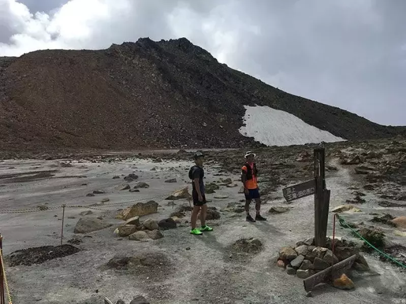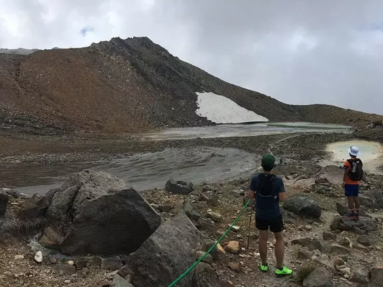 ニノ池に到着すると「噴火前はここ全てがエメラルドグリーンの水で景色が楽しめる池だったんだけど、噴火後は火山灰で池の半分が埋もれ、水も濁ってしまった」と大瀬くん。
