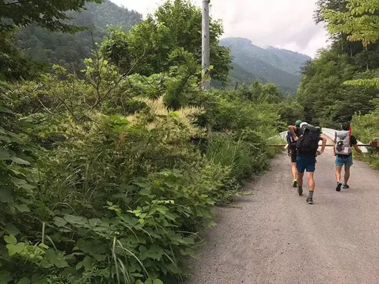 今回は渓流沿いで野営をする可能性が高いため、マウンテンカラ部メンバー3人は野営をするための装備、食材、お酒を分担して持ち歩く。