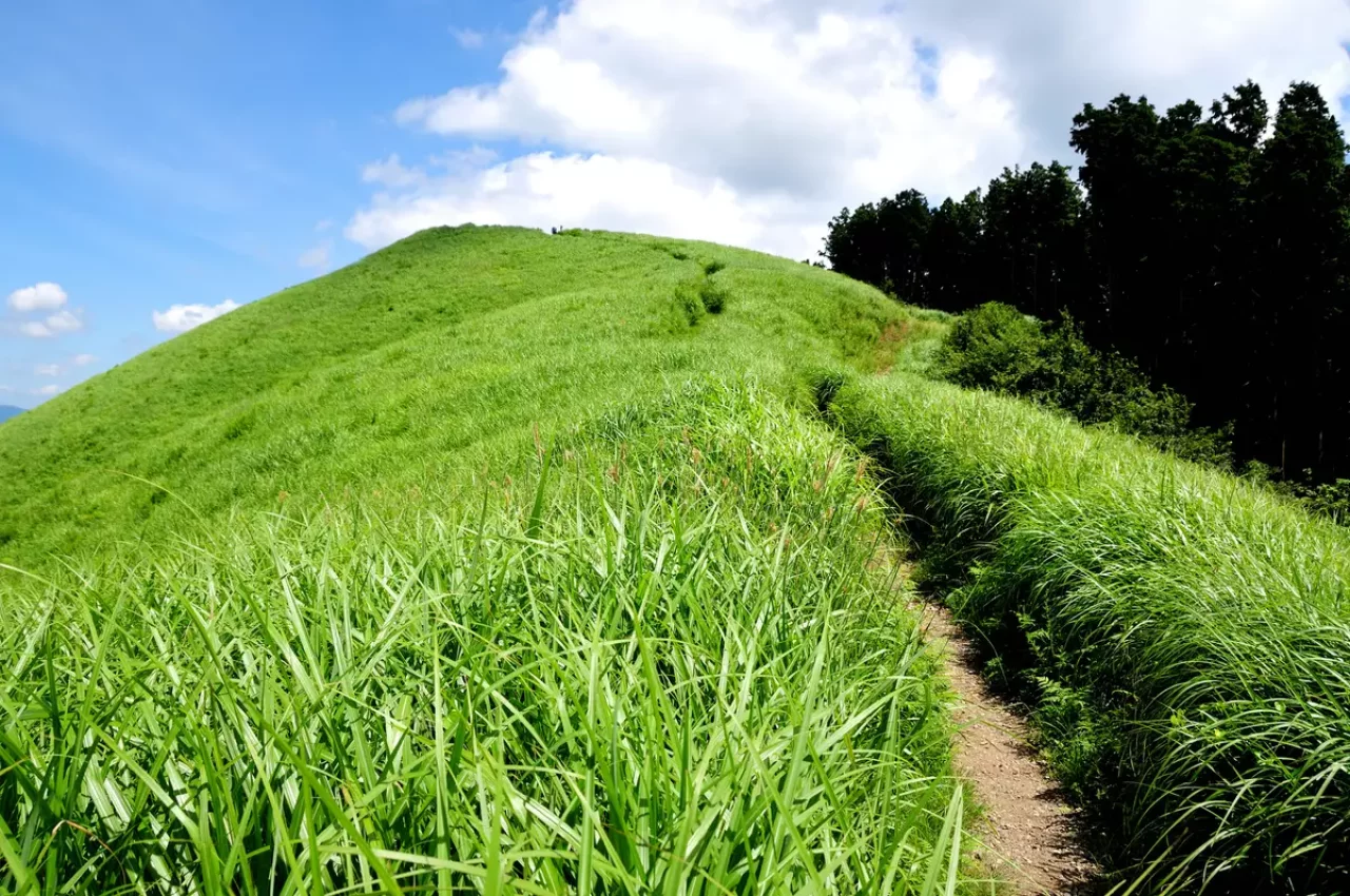 | 夏(6~8月) | 青やピンクのアジサイが見られ、山頂のススキは一面緑色。 緑色の山頂を見られるのは夏の間だけ! |
