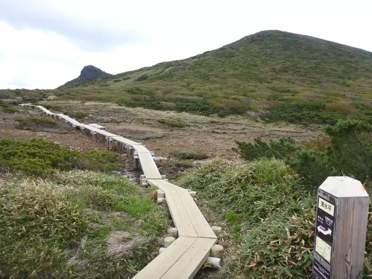 熊見曽根から1900m峰を越えると、湿地のため木道が設置された清水平まで下ります。