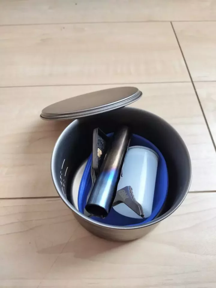必要最小限の装備にしています。400FD、マルチディッシュ、チタニウムストーブ、チタニウムウィンドスクリーン、フォールダーカップ、固形燃料ケース。合計で119g。