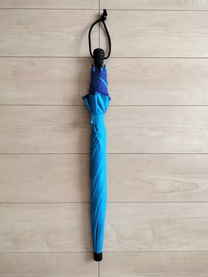 ちなみに、バックパックが濡れないように後ろが長く、グリップをショルダーハーネスに固定できる傘もあります。EuroSCHIRMのスイングバックアップハンズフリーという商品で、とても気になります。