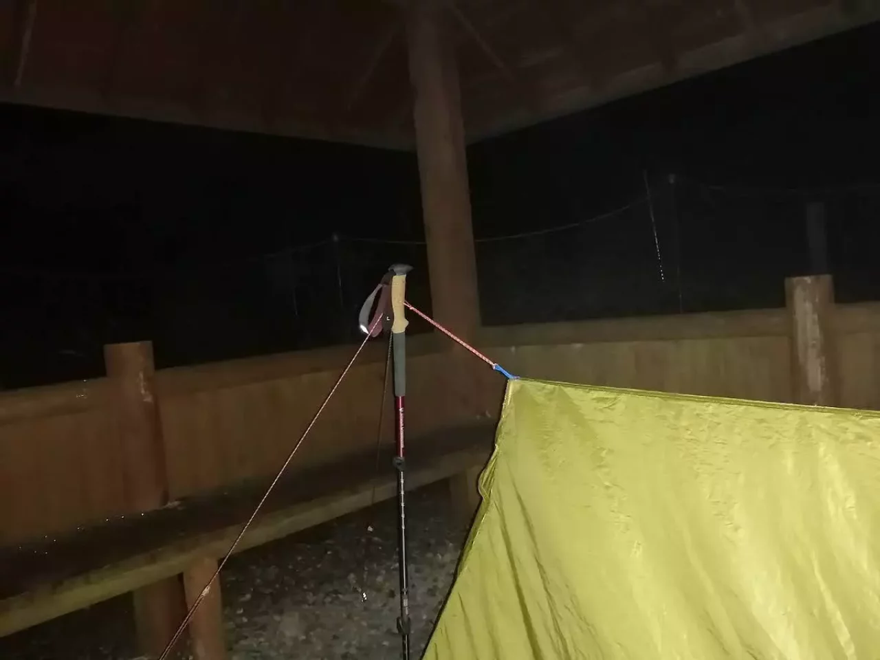 ▲11時間歩いた三浦峠の東屋の下で野営、ベンチ付き。