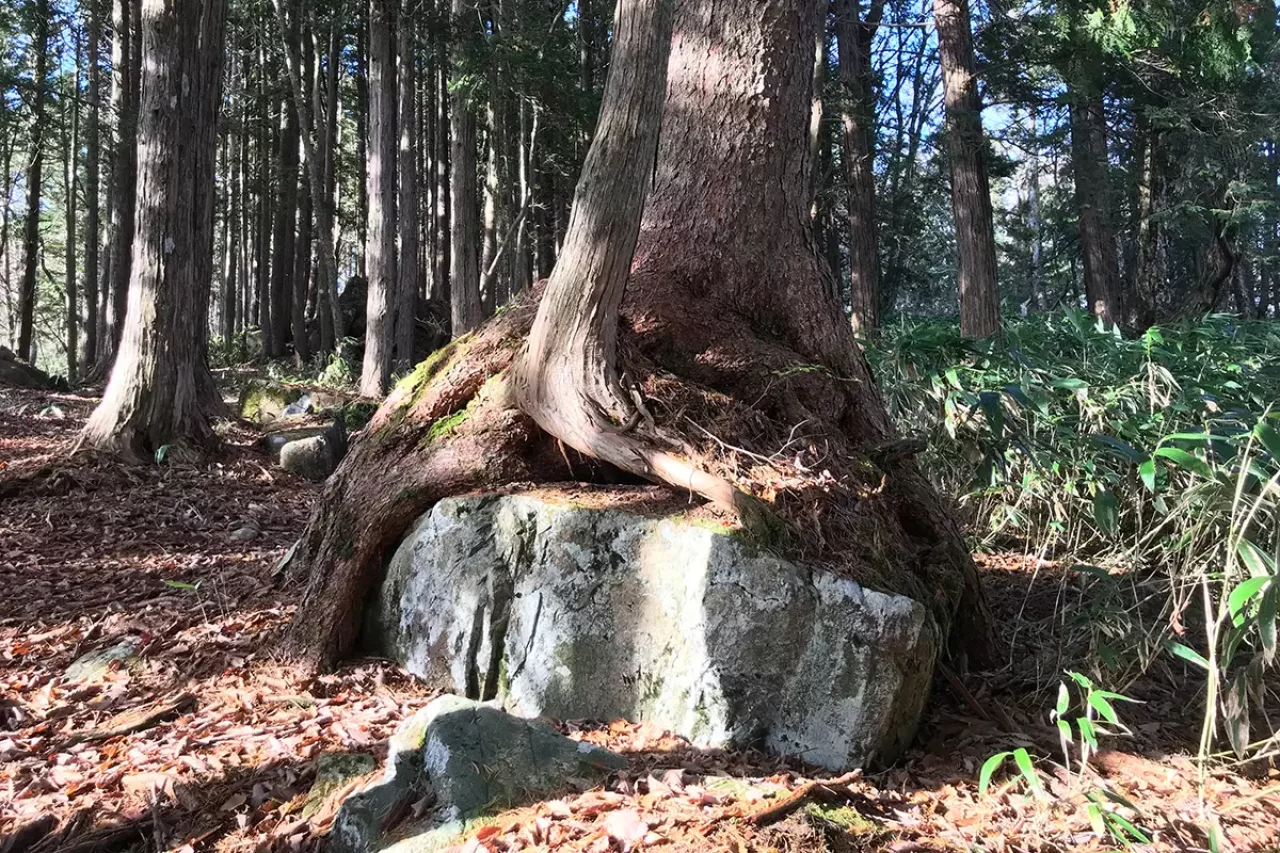 岩は火山岩で、「こうはならないよな?」と、30回は首を傾げるだろう。実物はかなりの迫力で「こんなに」大きな岩と木だったのかと驚くはず。象形文字のような模様が刻まれている岩もあるので、縄文時代のころから、宗教的なエリアとして大切にされていたのだろう。
