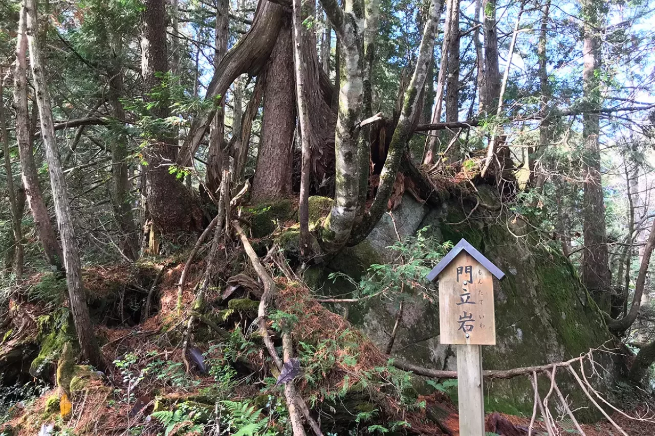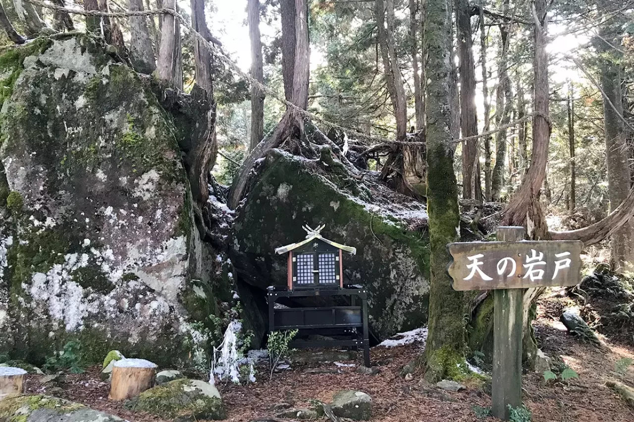 飛騨一之宮水無神社(ひだ いちのみや みずなし じんじゃ)の奥宮。「天の岩戸」はぐるりと一周できる。「天の岩戸」から御神水が湧き出る「天の泉」を訪れても、山頂へは約30分で到着する。「天の岩戸」はハイキングコースと合流する地点だ。