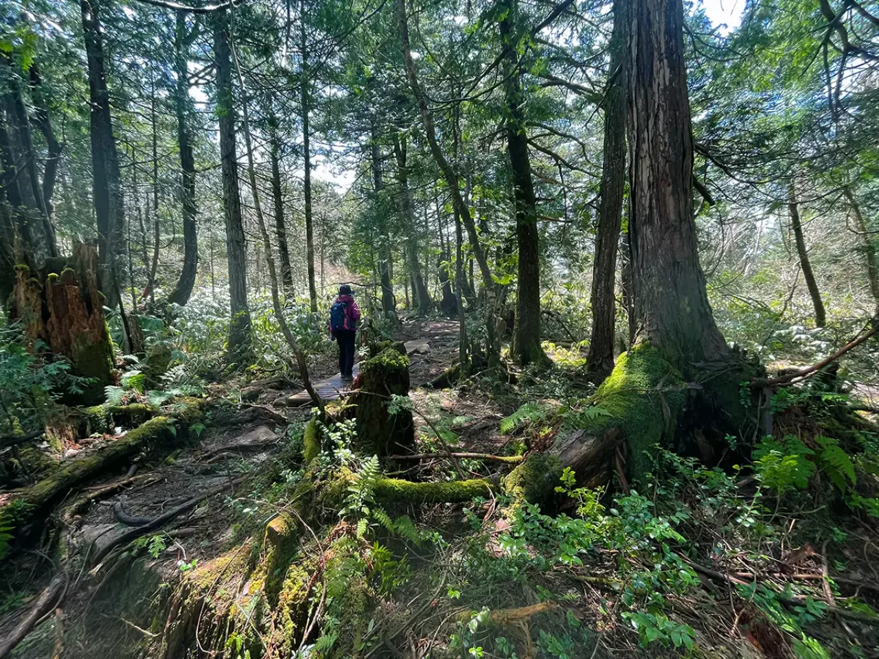 山頂付近は神秘的な雰囲気で、霊峰として崇められた雰囲気に満たされる。春は開放感あふれる、爽やかな森林浴ができ、あちこちに花が咲き乱れる。真夏は笹が高く育ち、ジャングルのような雰囲気に。