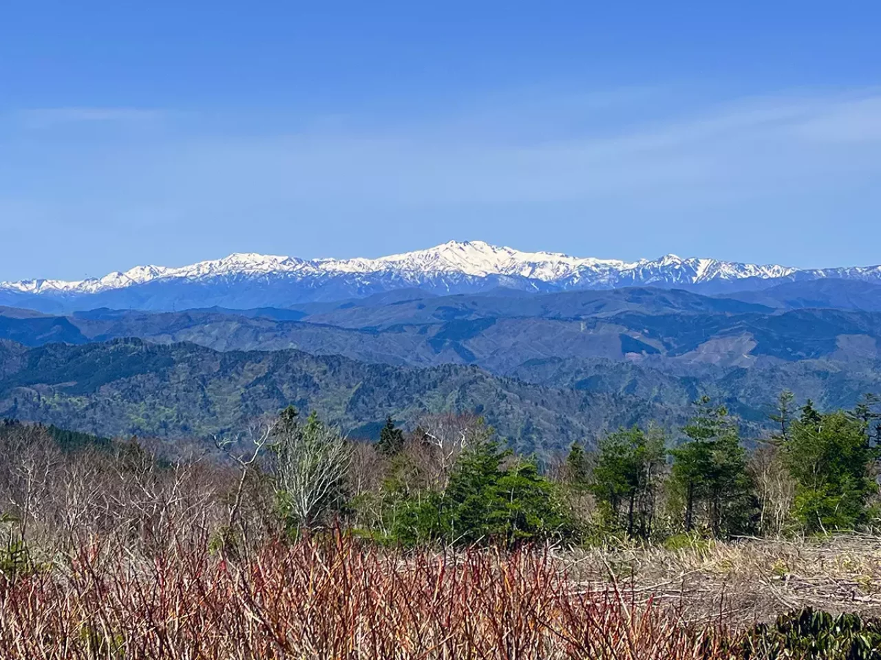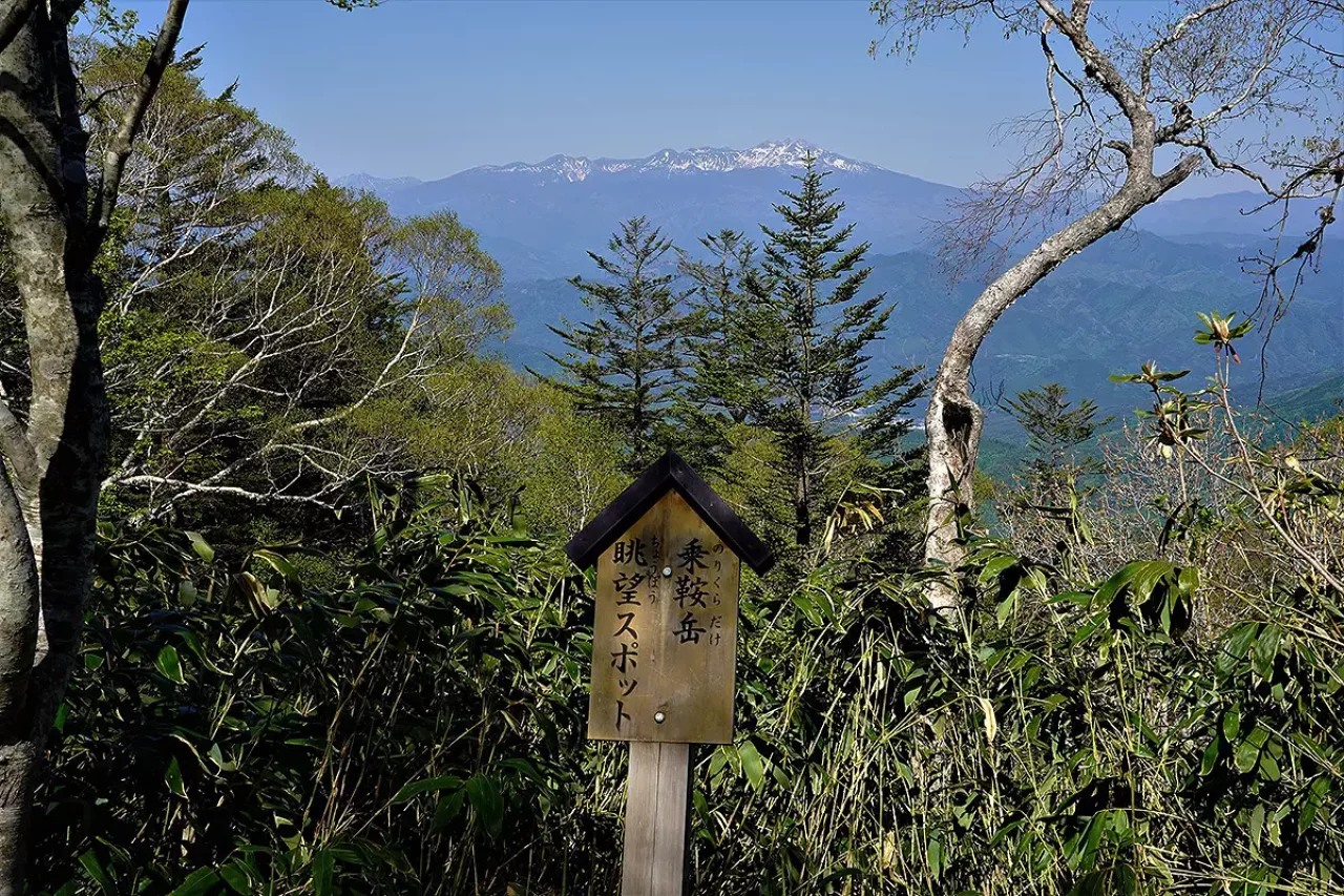 約12kmの歩行距離で、所要時間はおよそ6時間(休憩1時間含む)。「道の駅 モンデウス飛騨位山」駐車場から乗鞍岳がすでに見え、ゲレンデを登るごとに北アルプスや御嶽山が次々に見える。緑豊かな飛騨山脈の里山が目前に並び、高山の望む景色を引き立てている。