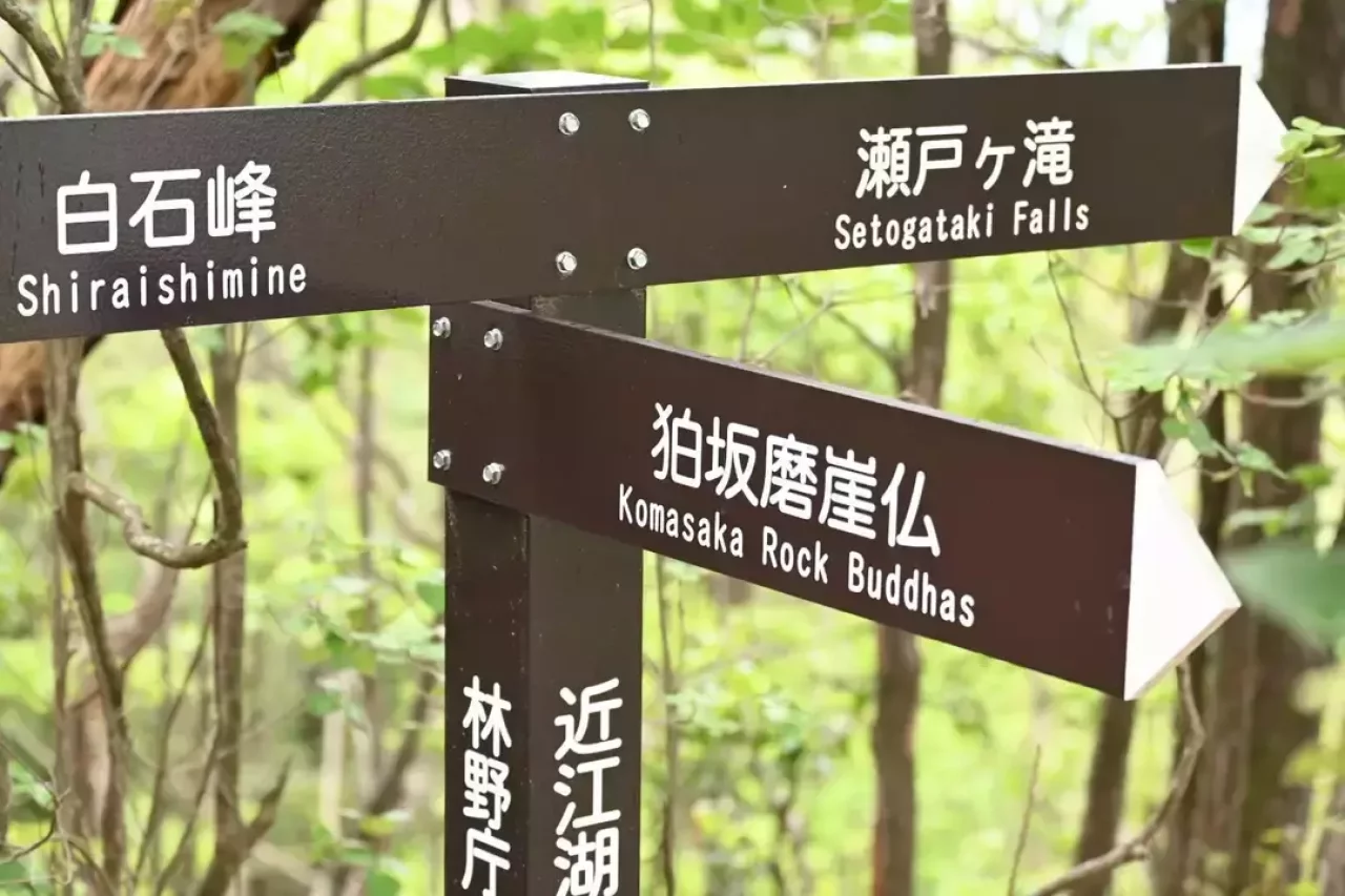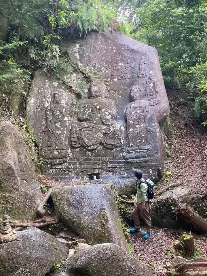 下山の見所の1つ、狛坂磨崖仏は巨石の中央に2mを越える如来像、脇に菩薩像が2体等が彫られていて圧倒される。基本的に傾斜がキツかったり、不安定な箇所も無くて歩きやすい。だらだらぁと長く感じる下りもお喋りしながらやとあっという間。