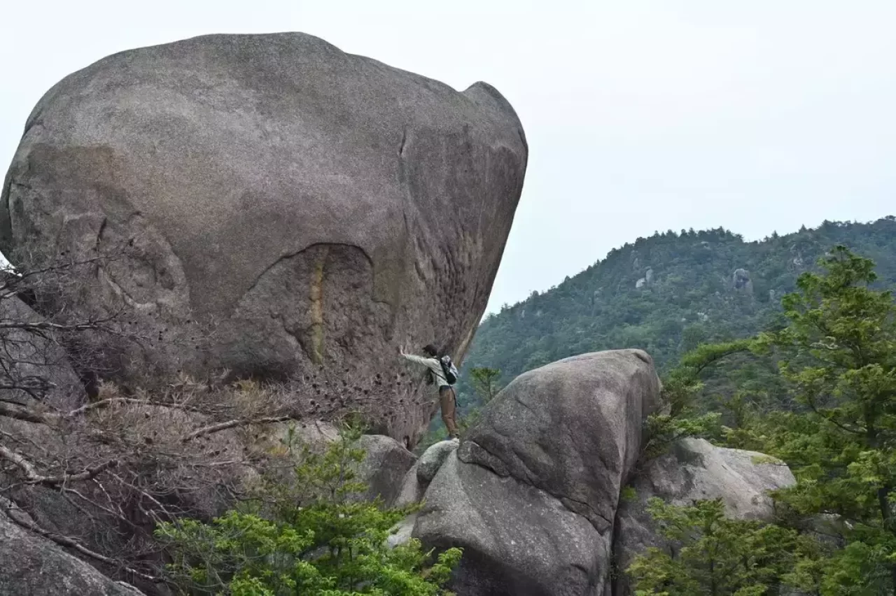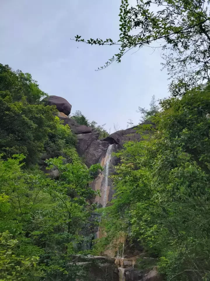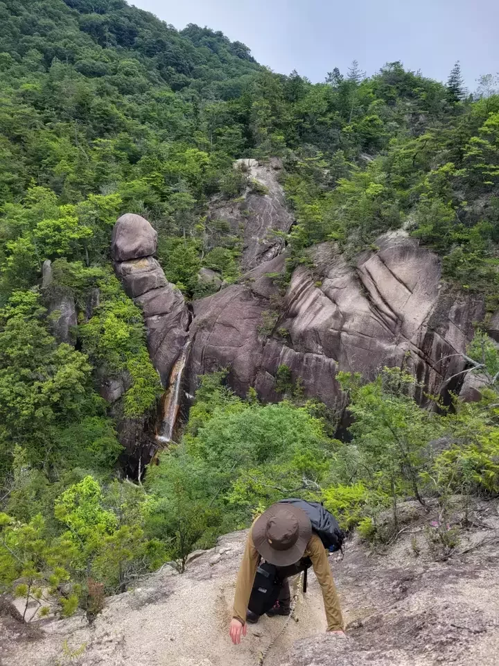 短いものの激登りを越えたら気持ちいい稜線歩き。トレイルは細いものの安定していて歩きやすい。さっきまでいた落ヶ滝を見下ろすお気に入りポイントも。相変わらずヘンテコな形の奇岩。