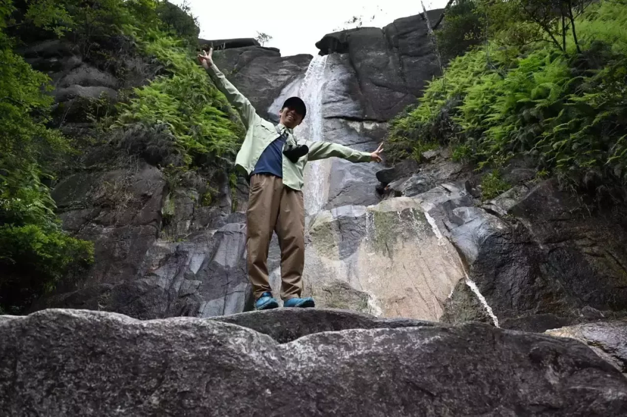 落ヶ滝到着。やはりいつもより水量多く豪快に流れている(少ない時はホントにチョロッて感じ)。毎回思うけど滝が流れる岩肌が黄色なのはなぜやろか。