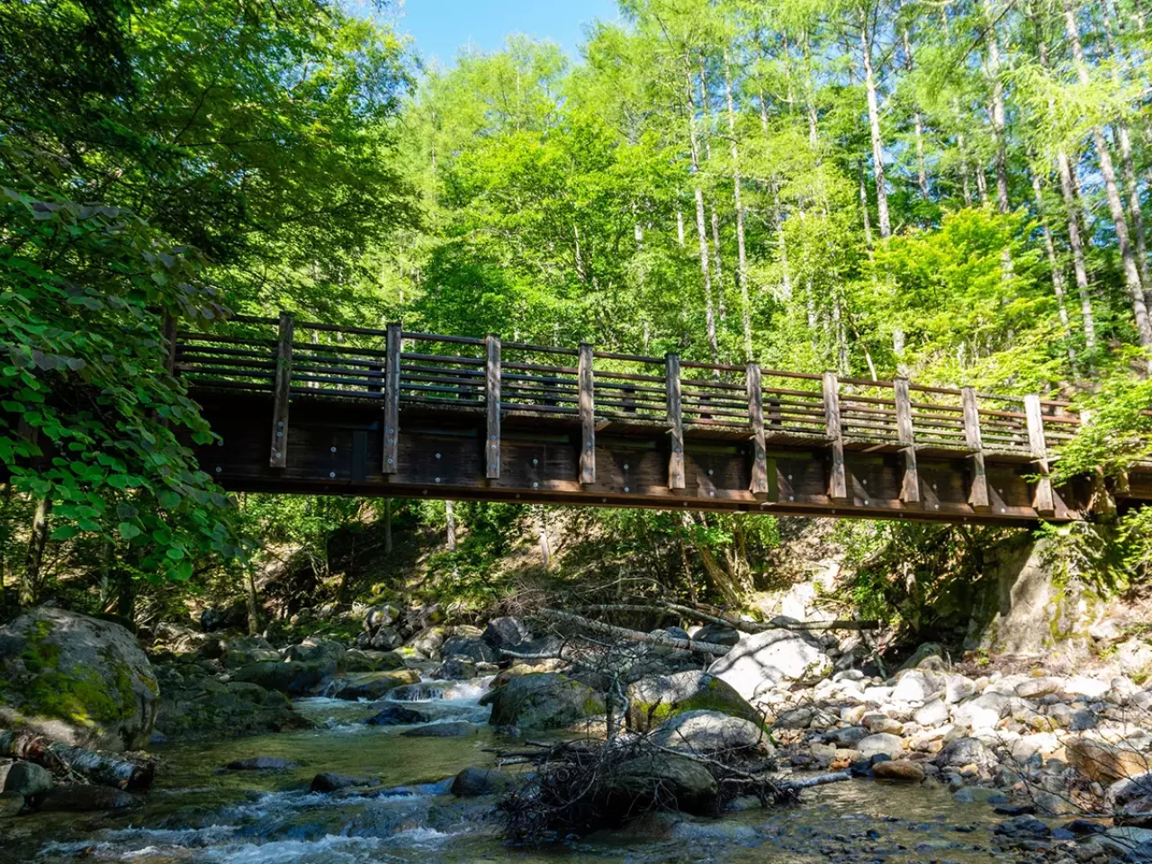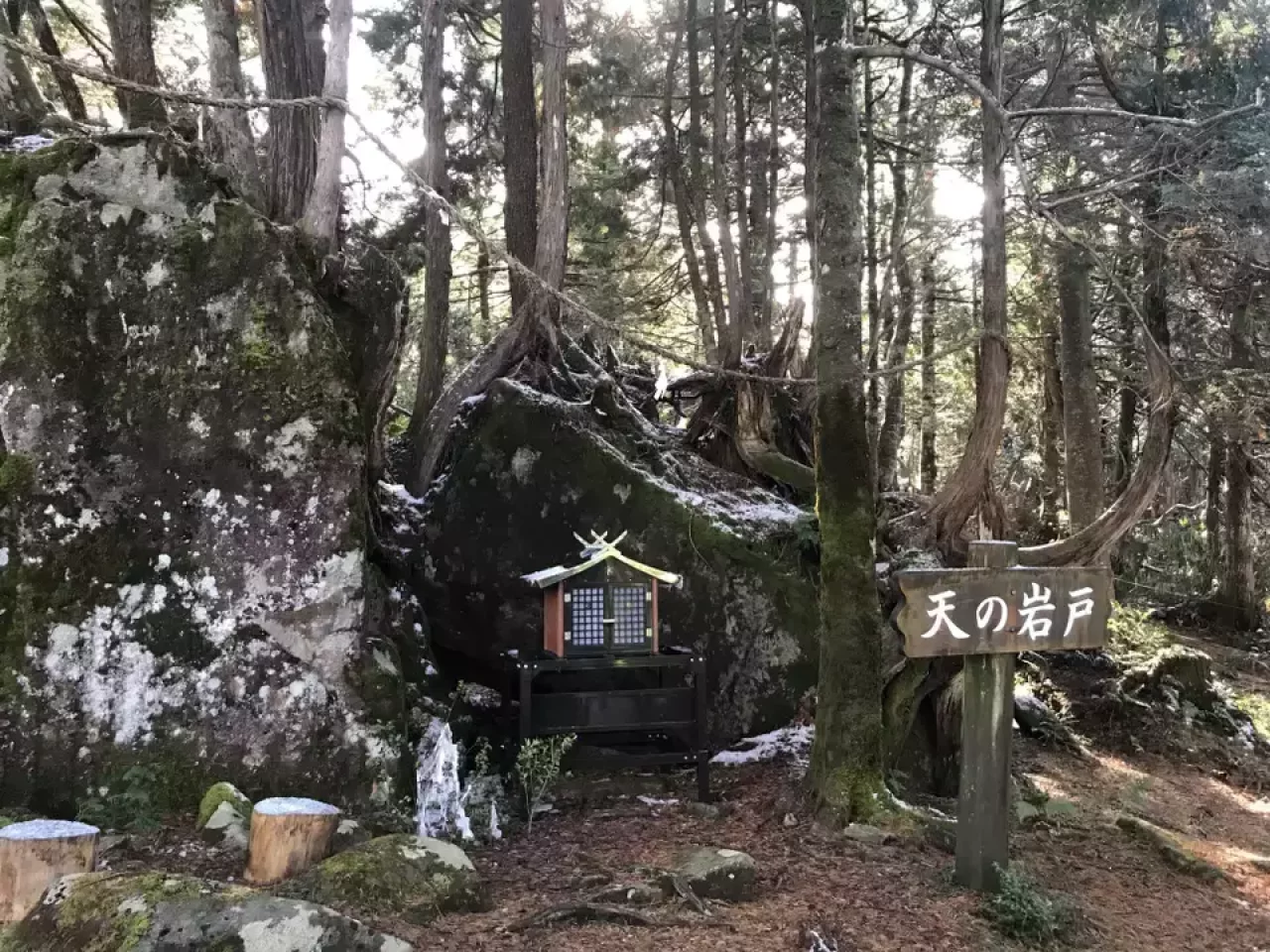 国有林林道を約15分(1km)歩くと、宮の大イチイの看板があり、川上岳の原生林へ入っていきます。うっそうと茂る原生林には、スギ、ブナ、イチイの巨樹が目立ちとても神秘的に。往復30分なので、初心者でも気楽にトレッキングを満喫できます。足場は滑りやすくなるため、最低限スニーカーは履いていたい散策路です。