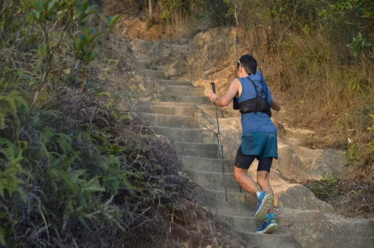 登りの際はグリップの下部を握ることでトレッキングポールを短めに持ちます。傾斜の強さに合わせて持つ場所を調整してください。肘は平地を歩くときよりも体側に寄せたほうが安定しやすいです。
