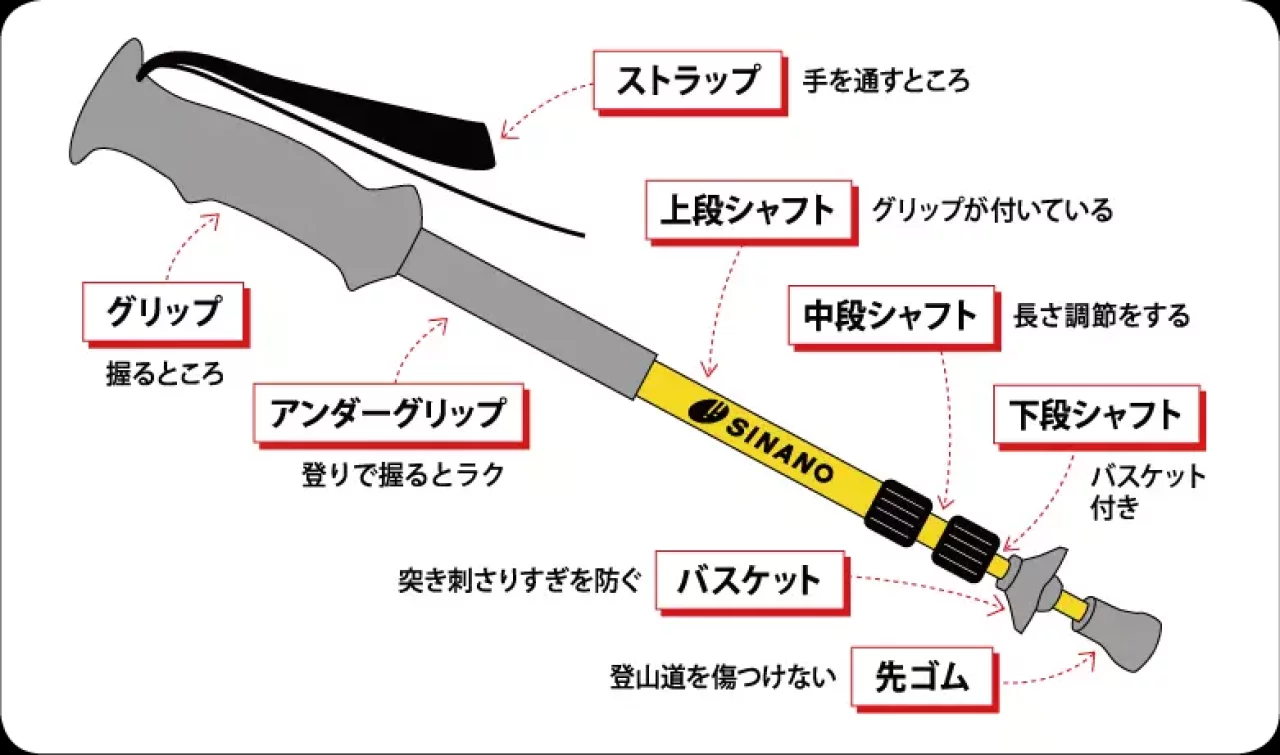 伸縮式のトレッキングポールは収納時にはサイズを縮め、使用時には伸ばして使用します。グリップのついている上段、石付きのついている下段と中段を合わせた3つの棒(シャフト)で構成されているものが主流です。