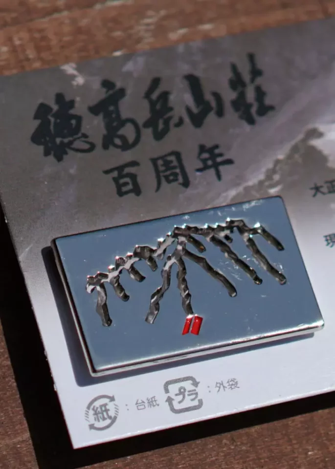 まずチェックしたいのが、今年穂高岳山荘に宿泊した人全員がもらえるという「特製ピンバッヂ」だ。穂高の稜線をかたどったキリヌキデザインで、表側には文字を入れず、裏側に「穂高岳山荘百周年」という文字を刻印。