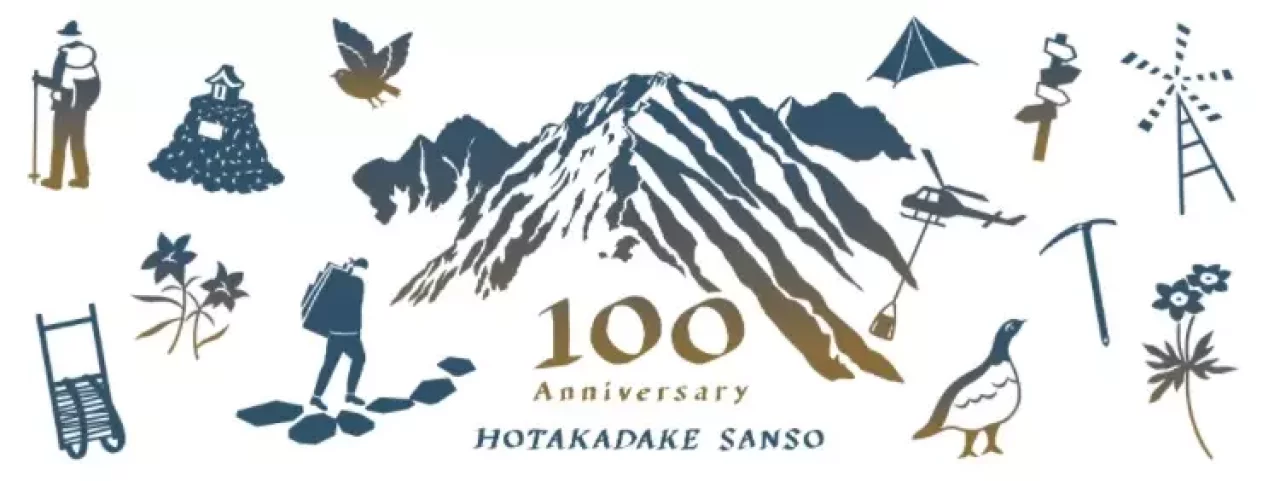 メインビジュアルをデザインしたのは、山や草花などをモチーフにした作品を手がけるテキスタイルブランド「H/A/R/V/E/S/T TEXTILE/DESIGN(ハーベストテキスタイルデザイン)」の真田緑さん。メインビジュアルには、歩荷時代からヘリコプター時代へ、そして変わらぬ奥穂高岳と草花や生きものたち、時代を超えて山を愛する登山者たちが表現されている。