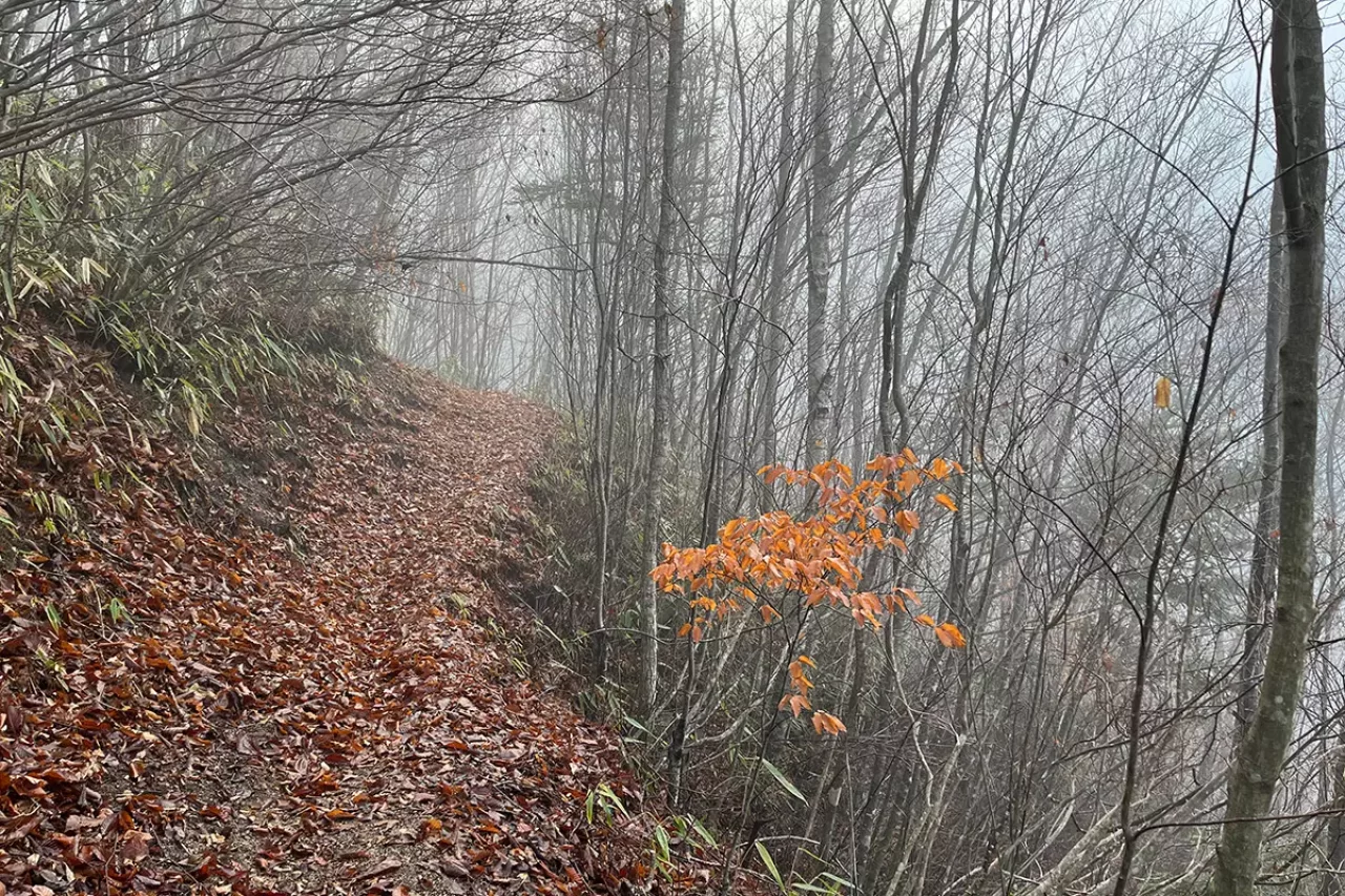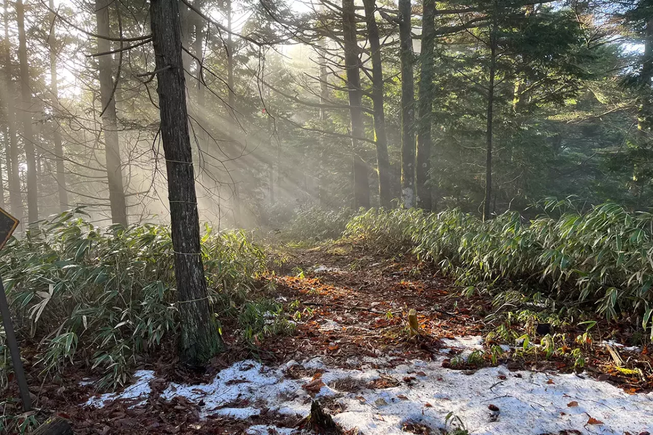 高鳥屋山は初心者程度の難易度で、登山らしいテクニックを存分に試せるコース。夏は熊笹の薮漕ぎがあったり、秋冬はふわふわの落ち葉の上を歩いたりします。細まった登山路や急坂が稀にありますが、それほどしつこくありません。歩いている場所の景色が常に美しいので、先に進むのが楽しくなる。そんな楽しい登山の典型になるでしょう。