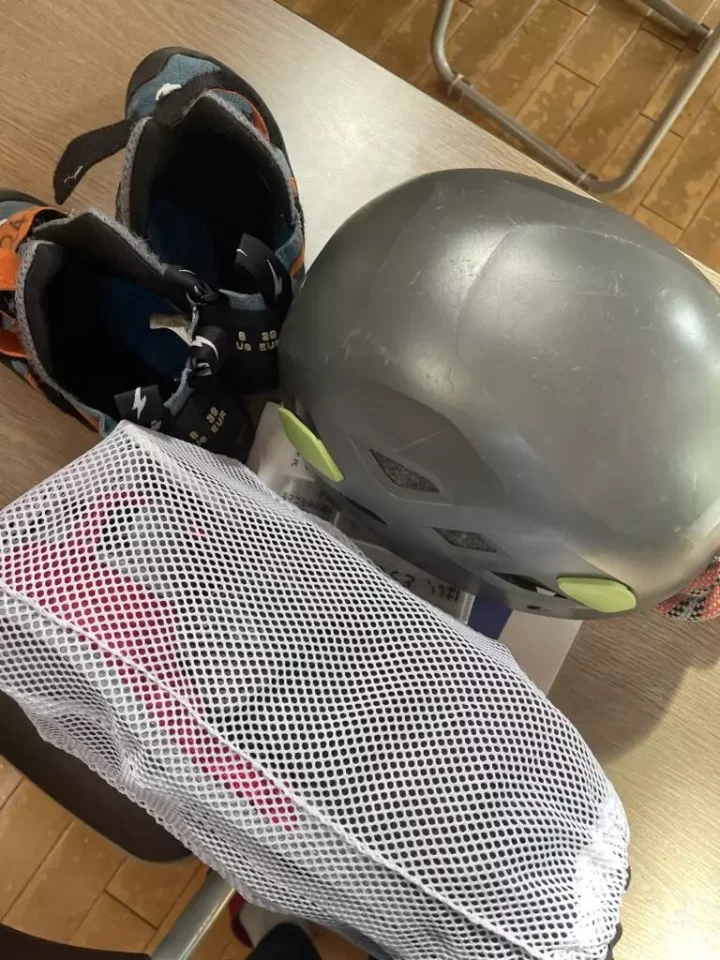 手前の袋に入ったものがハーネス、ヘルメットとクライミングシューズ。