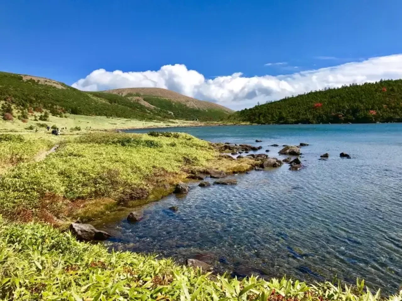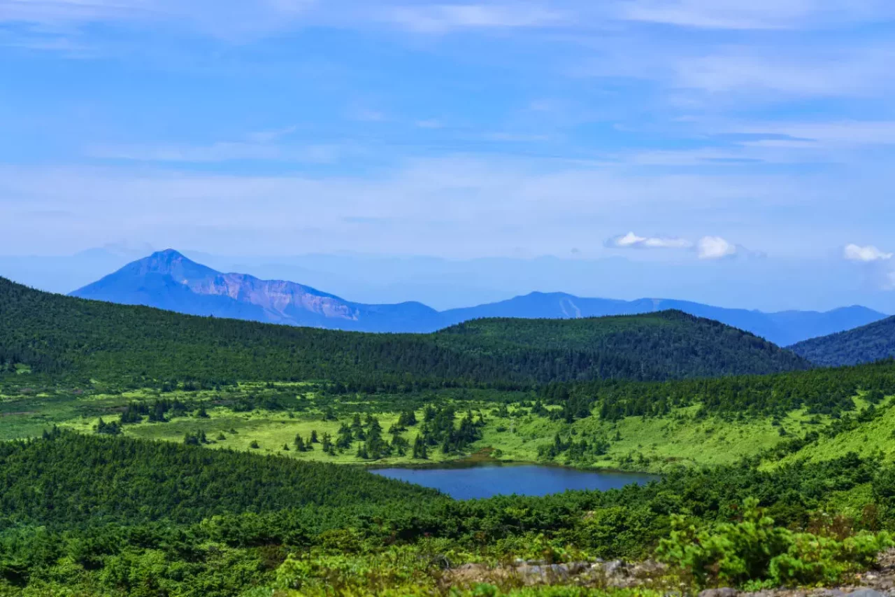 ワタスゲが揺れる気持ちのいい酸ヶ平湿原の木道を歩くと青く輝く湖面が見えてきます。魔女の瞳に引けを取らない透明度抜群の鎌沼の湖畔散策です。