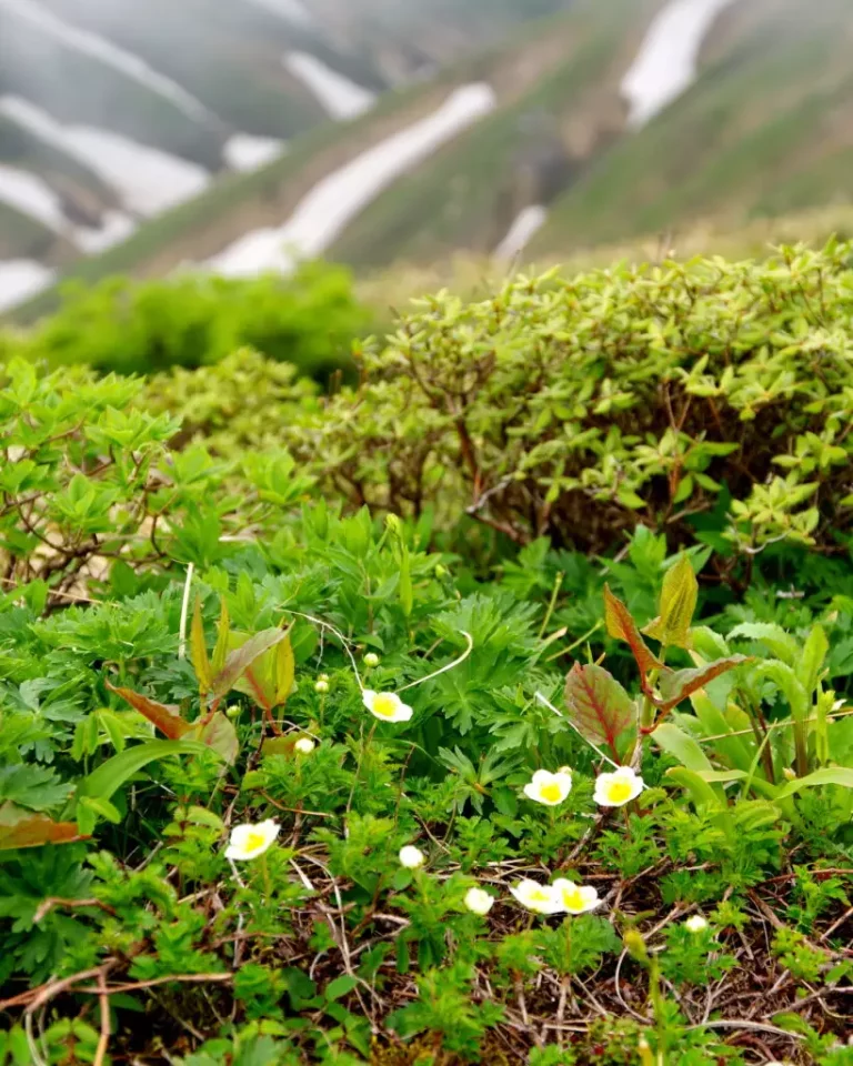 茂倉岳山頂、朝日を浴びて輝くミヤマキンバイ ミヤマキンポウゲの群落。ずっとミヤマキンバイと思い込んでました。花の色形と植生は凄く似てるけどキンバイはバラ科、ミヤマキンポウゲはキンポウゲ科と科が異なり、親戚ですらないという、、、。高山植物の代表、ハクサンイチゲはキンポウゲ科で親戚です。ちなみに桜と苺、リンゴはバラ科で、、、脱線しました。