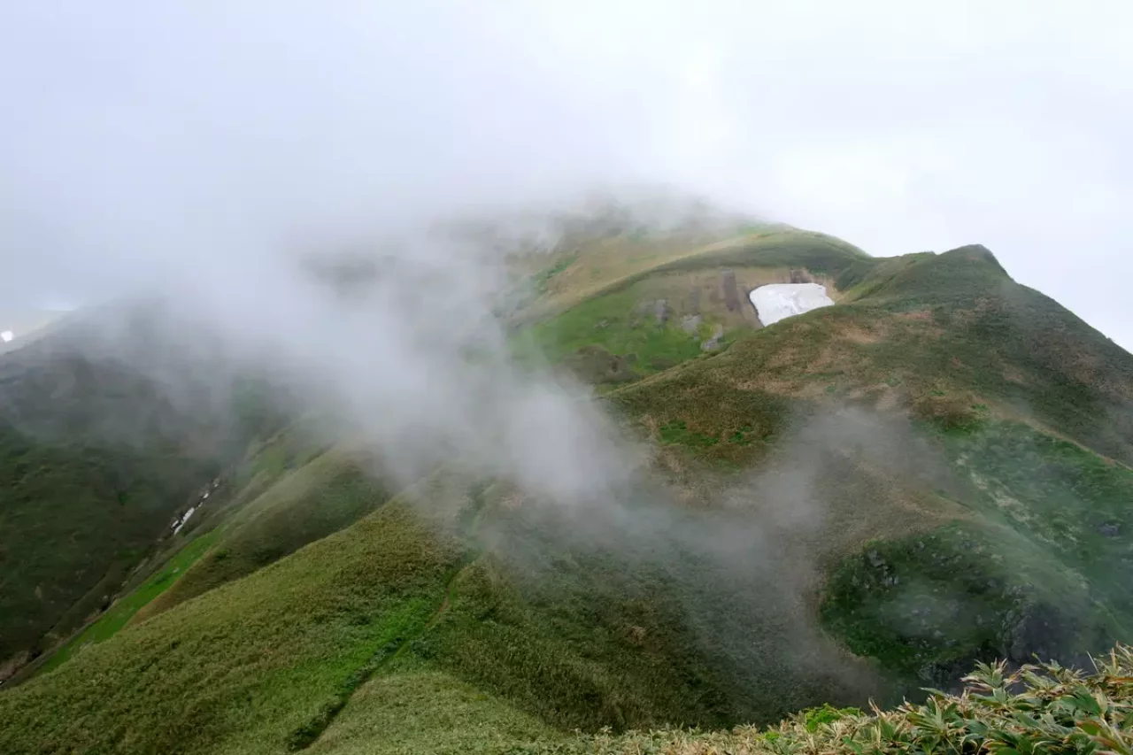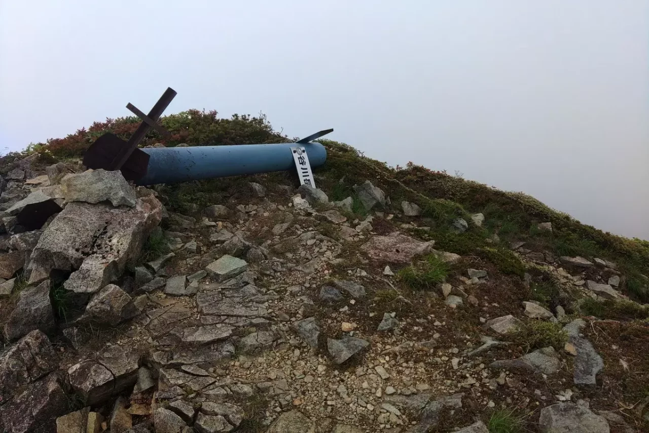 万太郎山頂は突風とガスの中、多くの万太郎山レポートでも「風の谷」との形容される場所、森林限界低いのには理由があるわけです。