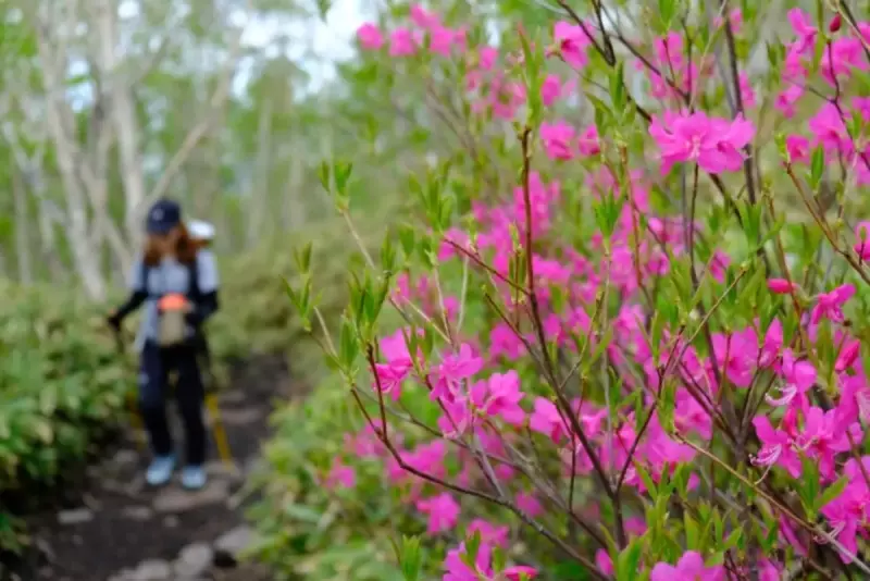 前半は白樺が生い茂る登山道で、特に夏の新緑はひときわ美しいです。後半は木がなくなり、笹の道を進むルートになります。6月中旬頃はツツジが彩る登山道を歩けますよ。