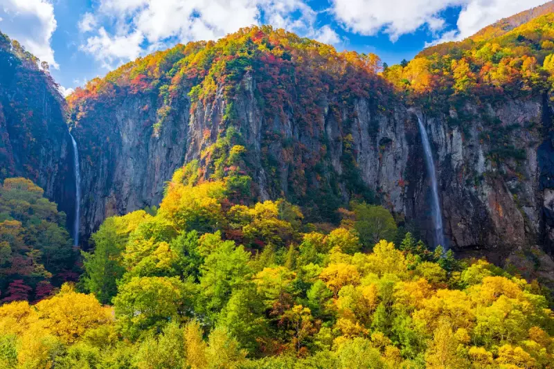 荒々しい岩をバッグに流れる2本の滝は自然のパワーを感じられ、思わず息を飲むような光景です。特に紅葉時期はまるで絵画を切り取ったような美しい景色が見られます。