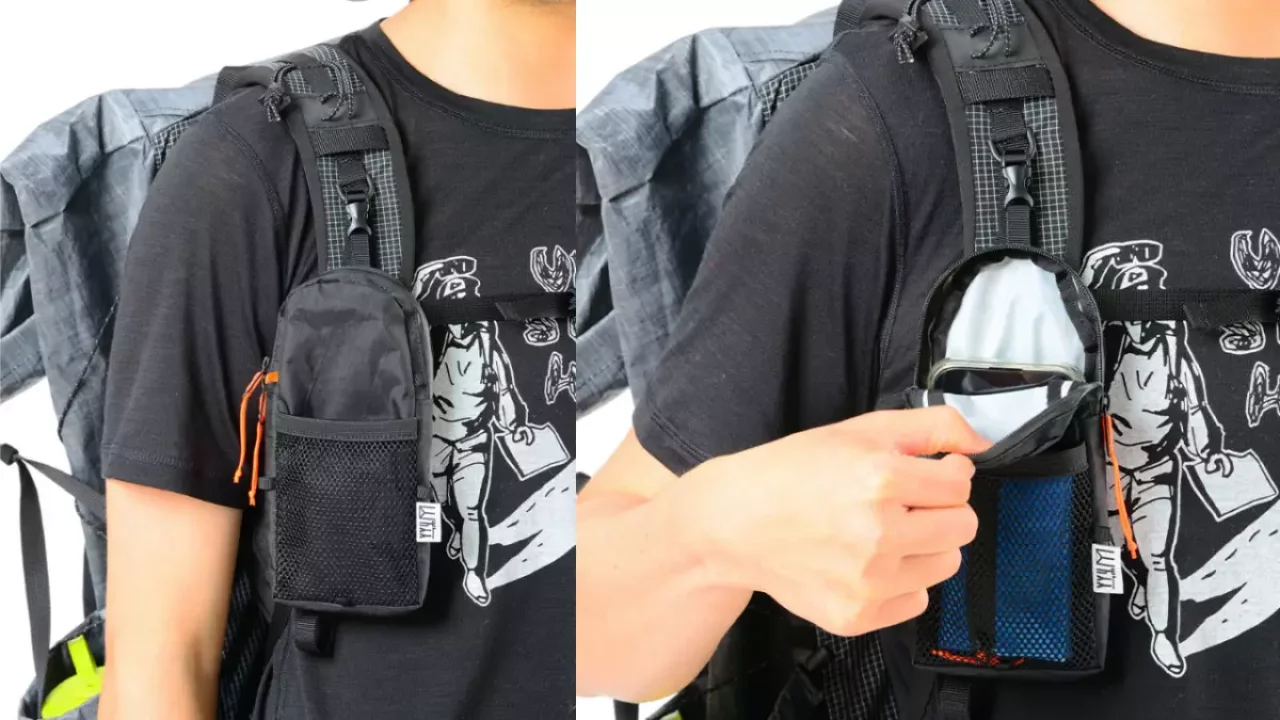 山旅のX-PAC製登山用スマホポーチは「UL的アプローチで軽量さと防水性装備」と紹介され、X-PACを使用した素材のこと、開閉しやすい止水ダブルジッパーについてのこと、本体のポケットとは別にメッシュポケットが設けられていること、別売りのバンジーコードで収納力をアップすることができることなどに触れていただいています。