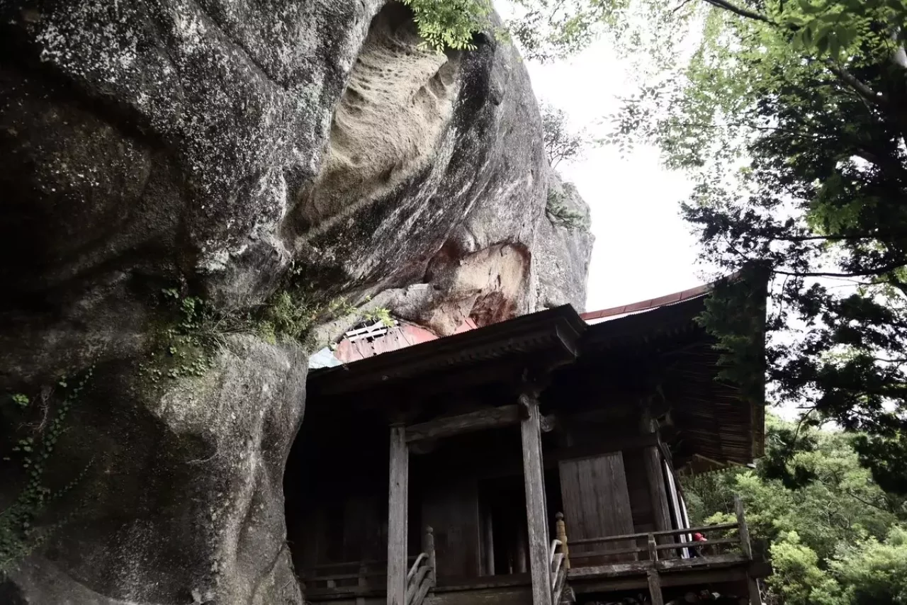 高宕山の中で最も迫力がある奇岩は、山頂手前にある高宕観音堂。本堂が岩にめりこんでおり、思わず息をのむような光景です。伝説によると高宕観音は、奈良時代に行基が高宕山を訪れた際に多くの人にご利益を施そうとして彫刻した霊像とのこと。五穀豊穣や厄除けにご利益があるとされ、遠方からも参拝者が絶えなかったそうです。