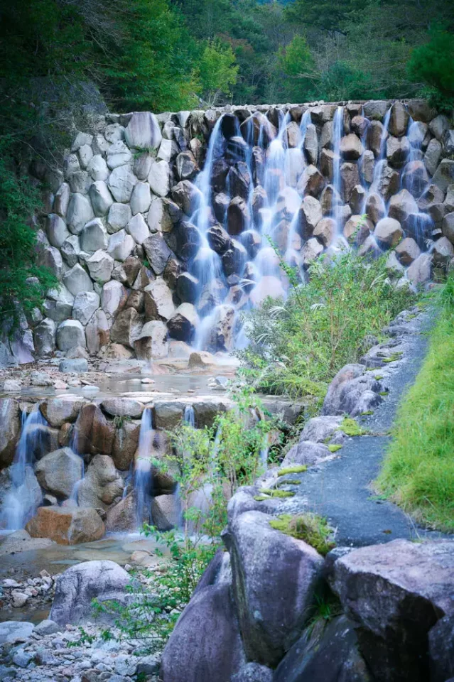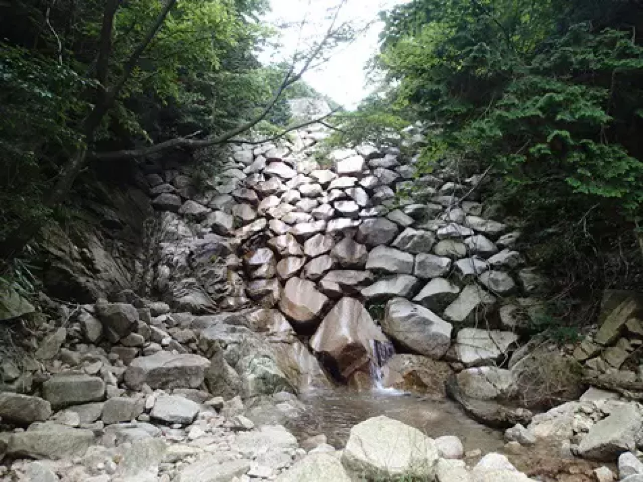 登山道にある「なわだるみ堰堤」は積み方が見事です。天守閣を上に置きたいぐらいの美しい積み方で、お城の石垣のようにみえます。それもそのはず、頑丈な理由は、自然の石をバランスよく積む「千草石工」の技とのこと。三重県の登録有形文化財に指定されています。