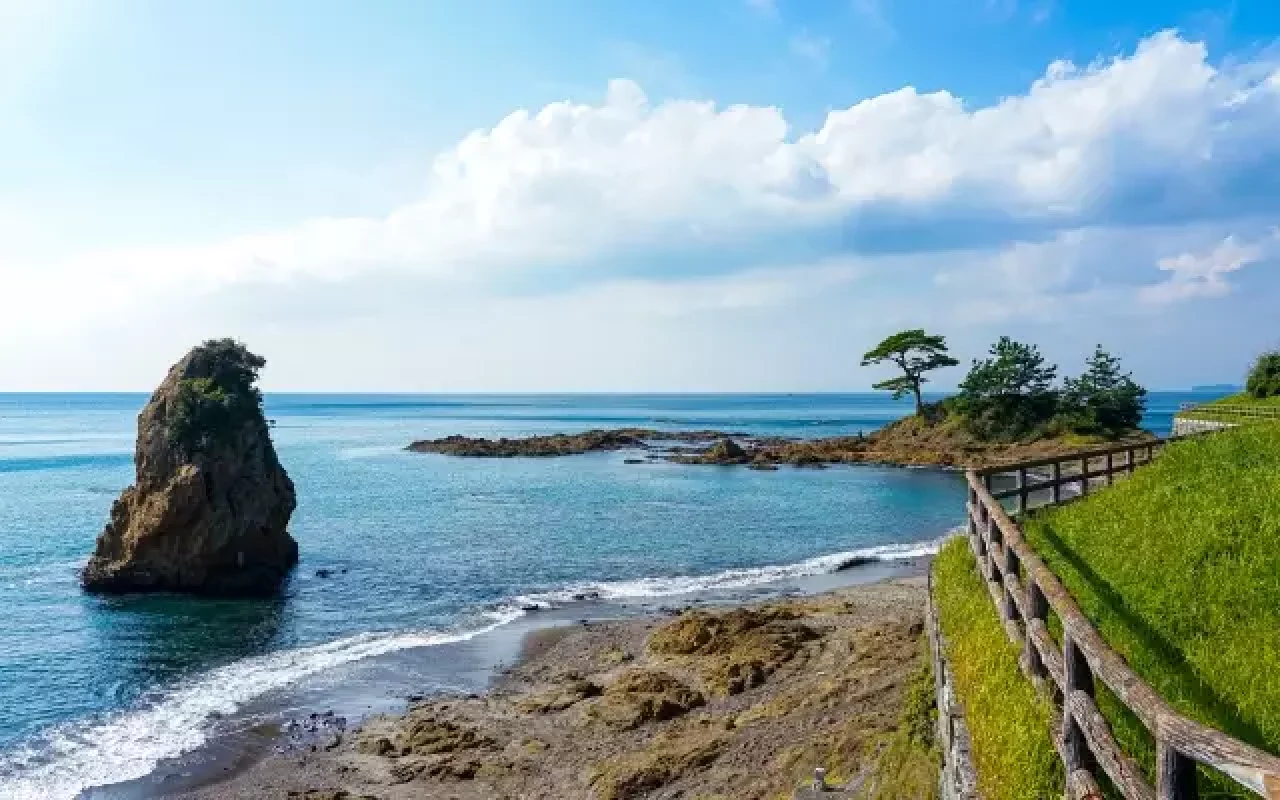 海に突き出た奇岩「立石」を中心とした海岸一帯が、かながわの景勝50選になっています。水平線上にそびえる富士山とのコントラストが見事で、かつては初代安藤広重や、明治の西洋画家・五姓田(ごせだ)義松らが描き、現在は多くの写真家がカメラを構える風光明媚なスポットです。