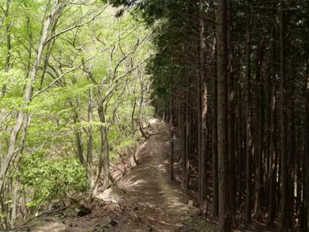 武甲山山頂までは周回コースと同じルートですが、山頂以降は狭い道が多く片側が切れ落ちている箇所もあるので注意が必要です。とはいえ危険な場所を除けば基本的には気持ちの良い林道が続いています。