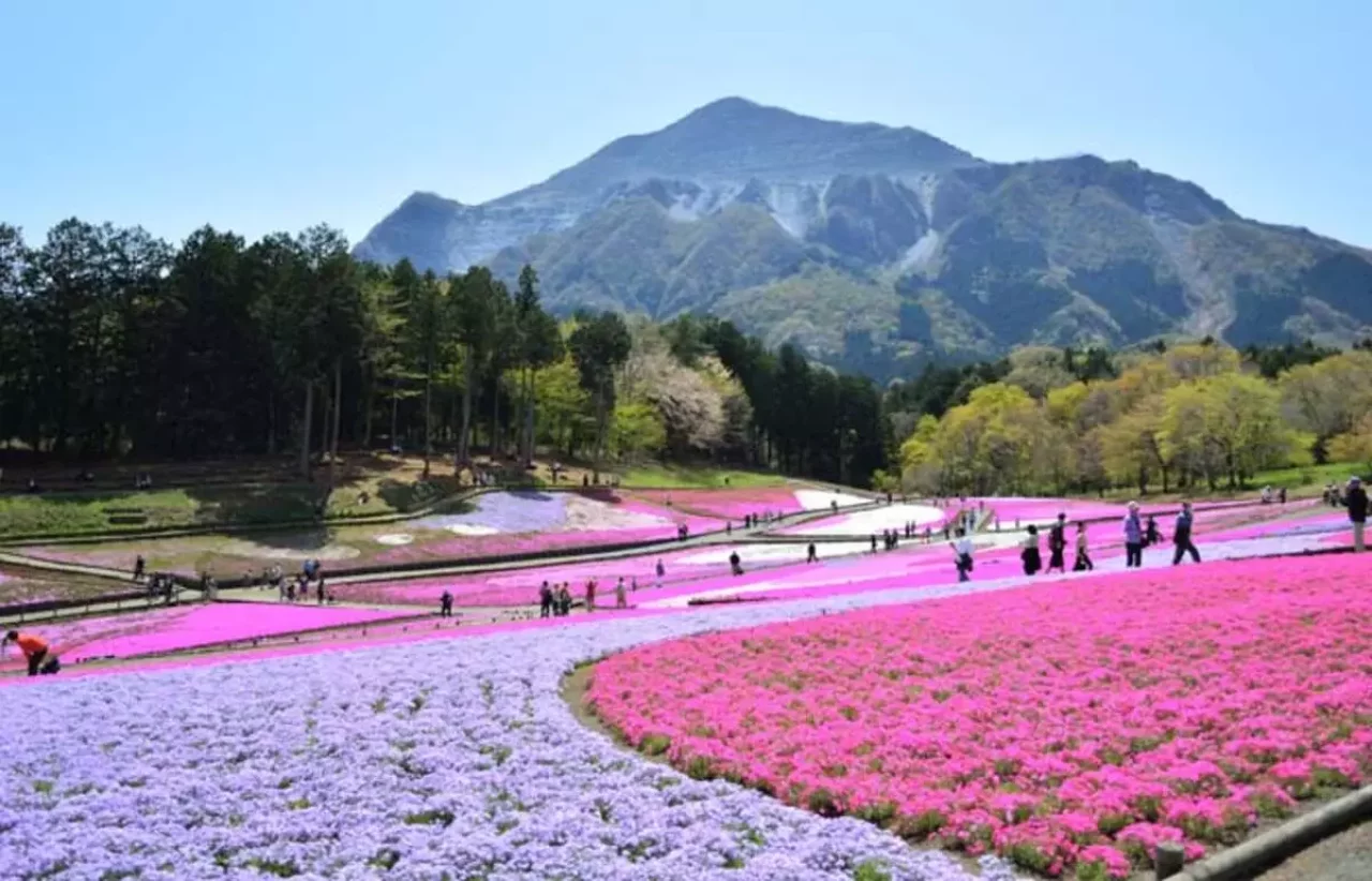 羊山公園で特におすすめなのが、17600平方メートルもの広大な地に咲く「芝桜の丘」。9種類の芝桜が植えられており、ピンクや白、紫など様々な色で彩ります。40万株以上植えられた芝桜と奥にそびえ立つ武甲山のコラボレーションの美しさは圧巻。例年5月初旬が見頃です。