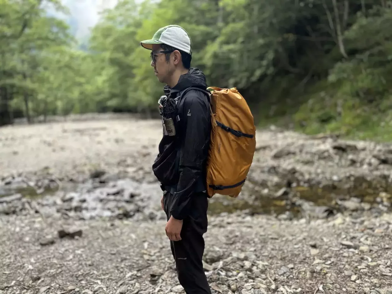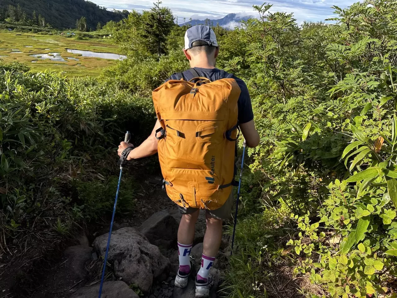 体の横からはみ出ない薄く細長いシルエットなので重心バランスをとりやすく、横ぶれしづらいザックです。また以前使用していたザックは登山道を歩いているとよく木々にザックが当たって歩きづらさを感じることがありましたが、そのようなことがほとんど皆無です。