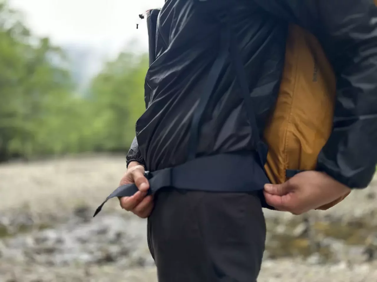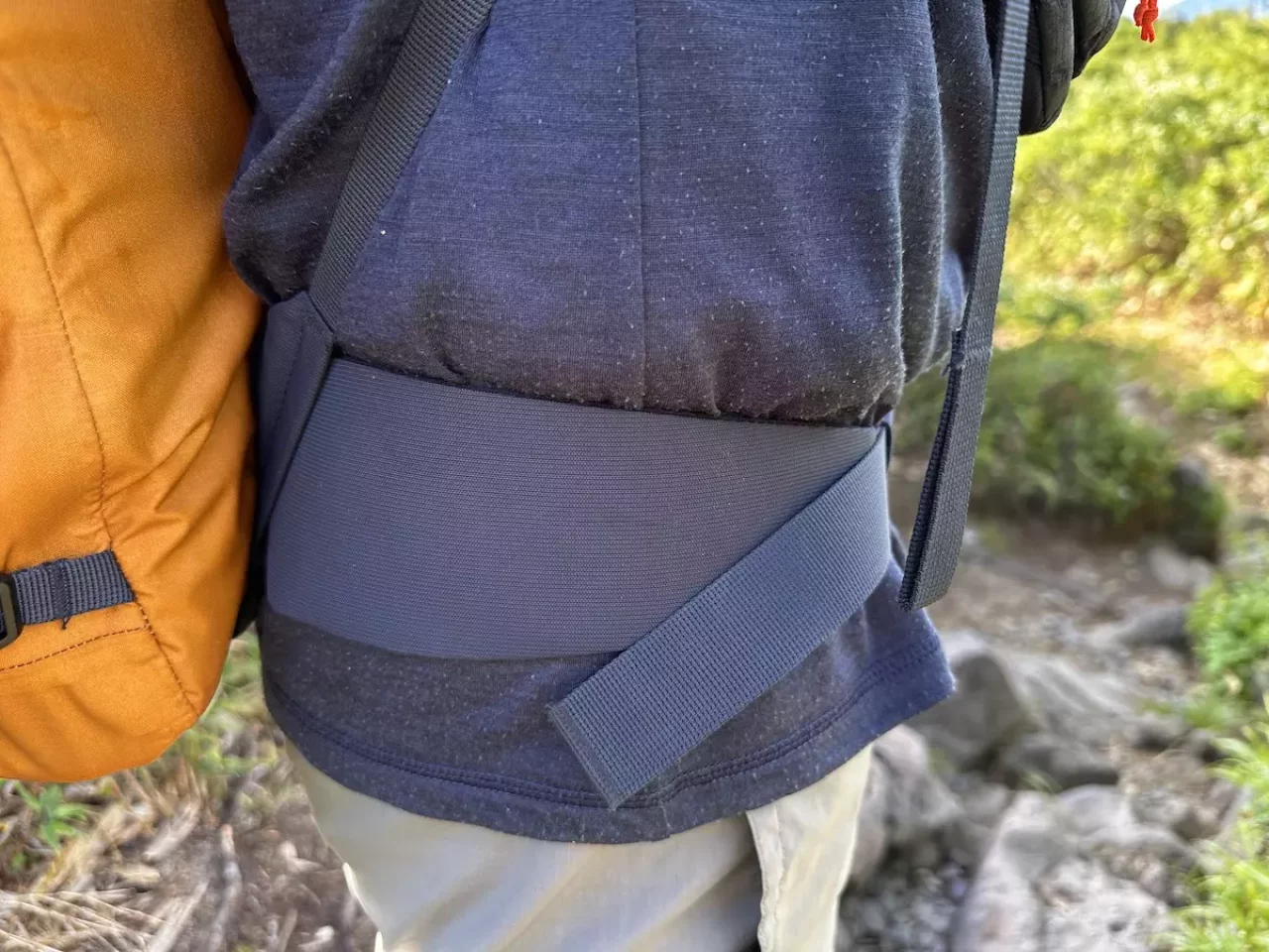 ウエストハーネスの柔らかな素材は腰回りに柔らかくフィットし、ザックがブレづらく快適です。