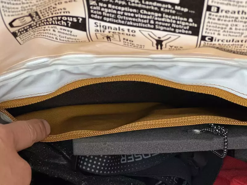 ザックの内側に設けられた背面部分にはジッパーがついていて、中には硬めのパッドが備わっています。これがフレームのような役割を果たしており、取り出しも可能なのでパッドをマットのように使用することもできます。