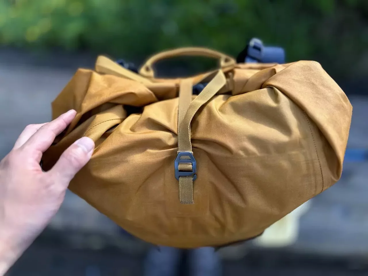 防水ファブリックを使用しているので雨に当たっても保水してザックが重くなりづらく中のものを濡らす心配が非常に少ないです。シームテープが施され、さらにロールトップタイプなので雨が降っても中のものが濡れづらい安心感のあるデザインです。