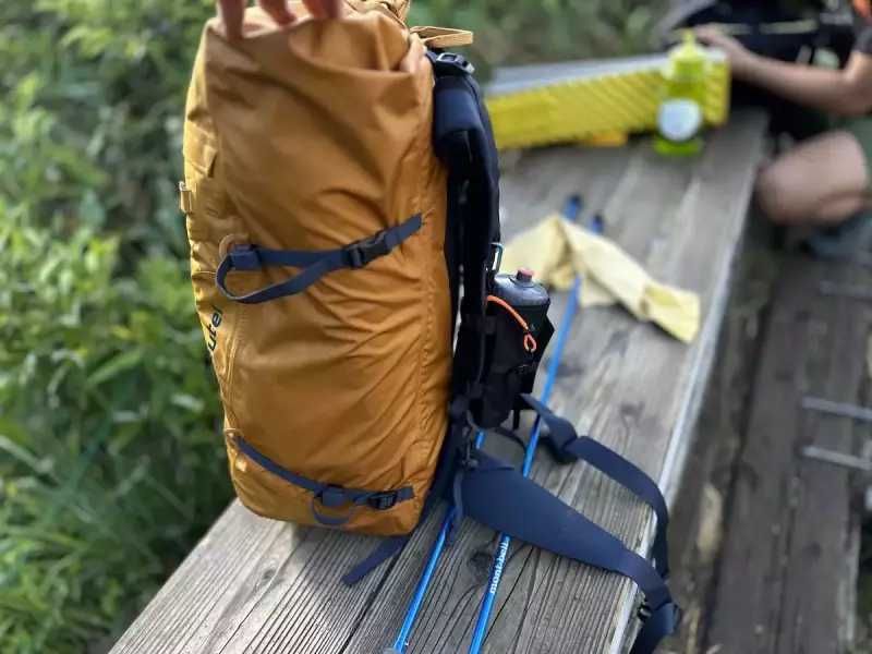 登山用ザックの多くに備え付けられているウエストハーネスのポケットや、ザック本体のサイドポケット、雨蓋、ハイドレーション対応など一切をそぎ落とした潔いデザインです。
