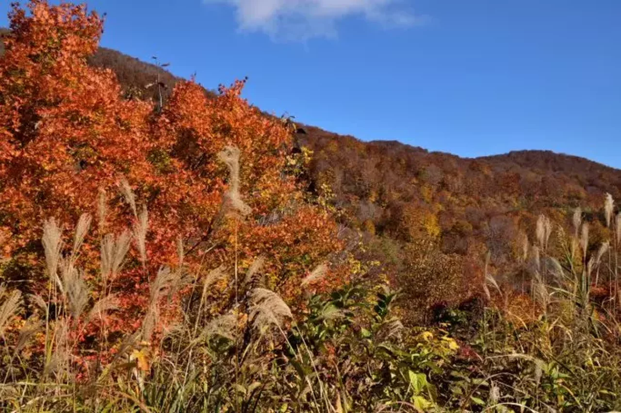 残雪が無くなると、山の花々が咲き始め、また一味違った里山らしい低山へと変貌していきます。短い夏が終わり、秋になるとブナの森は一斉に紅葉し始め、辺り一面を黄金色の世界で包み込んでいきます。