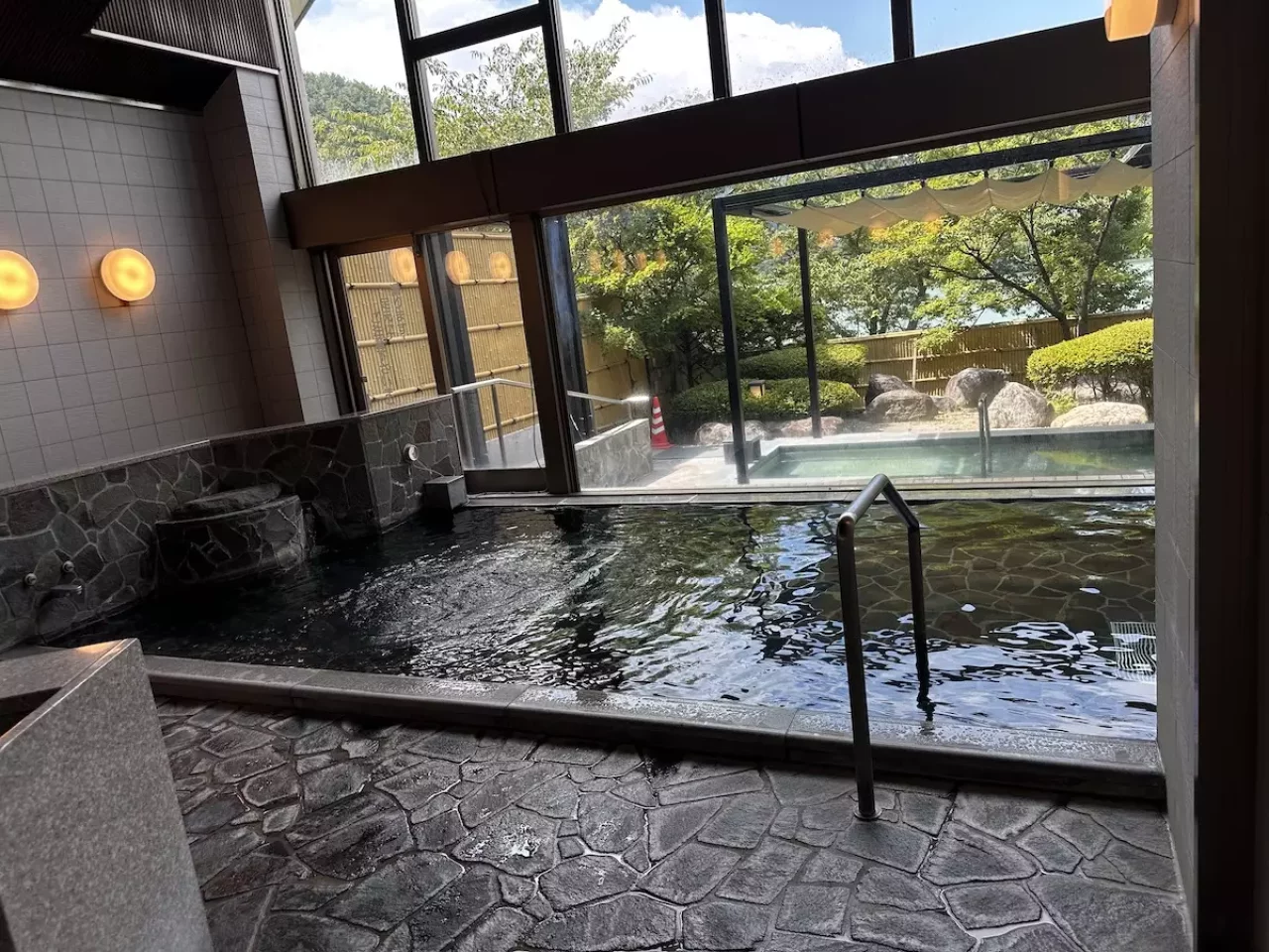 ここの温泉は日帰り入浴料金が800円で信州高速温泉さくらの湯の600円と比較すると若干高めですが、比較的空いていること、そして内風呂はぬるめで休むのにちょうど良い温度であること、泉質はヌメリ成分の硫化イオンを多く含んでいることなどでおすすめです。